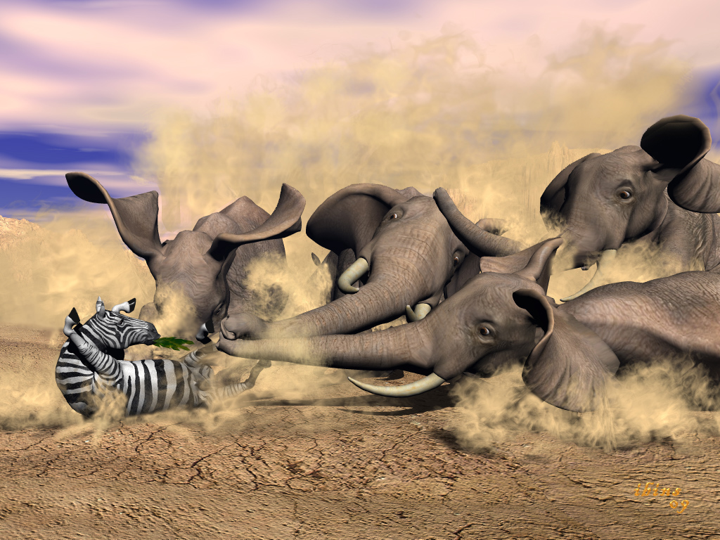 So, das Zebra hat es ziemlich sicher geschafft. Der Elefant ganz links (vom Betrachter aus gesehen) ist sich schon in der vorigen Szene ungeschickt auf den eigenen Rüssel gesprungen, der pflügt jetzt mit seinen Stoßzähnen die Wüste auf ... die anderen drei erleben gerade die Wirkung des Trägheitsgesetzes.