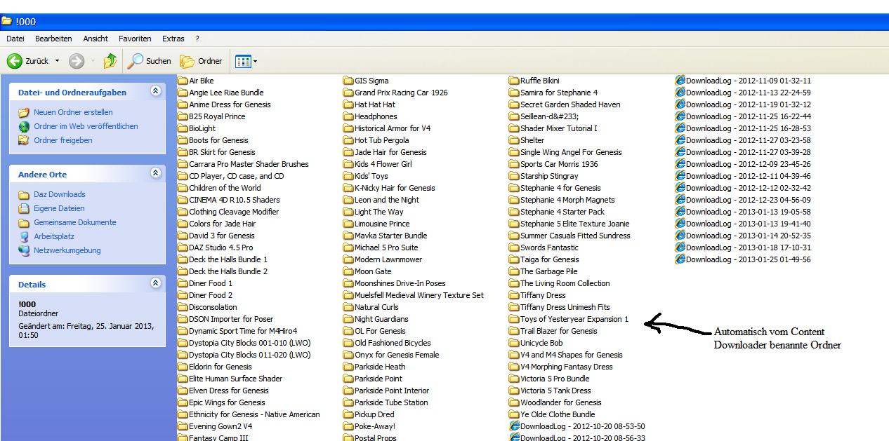 Wenn Du beide Tools hast, wird Dir auffallen, daß der Downloader von Taosoft, die Files in Ordner verpackt - so wie Du's in meinem Screenshot sehen kannst. Über die DownloadLogs merkt sich das Programm, was es schon runtergeladen hat, so daß Du nichts doppelt lädst.