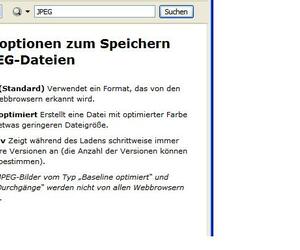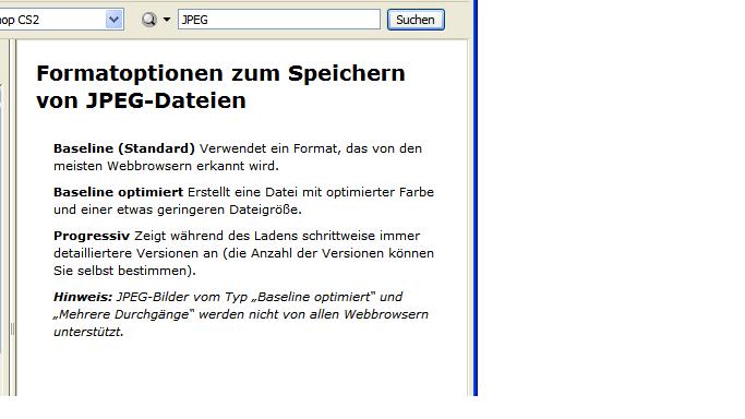 - bei "Abspeichern unter" wird jetzt auch JPEG angezeigt - und was sehr hilfreich war: in der Hilfe gibt es eine kleine Info zu den Formatoptionen bei JPEG (s.u.)