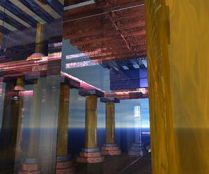 Die zur Außenmauer gelegene Hälfte dieser Balken werde ich noch in ein helleres Material übersetzen. Vielleicht ähnlich wie die Balken der Stirnseite in rosa-weiß-farbenen Marmor.Meine Idealvorstellung ist, hinterher mit der Kamera in den Tempel reinfahren zu können, deswegen auch die extreme Genauigkeit im Aufbau.