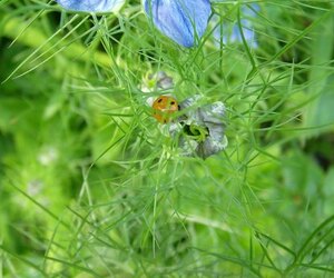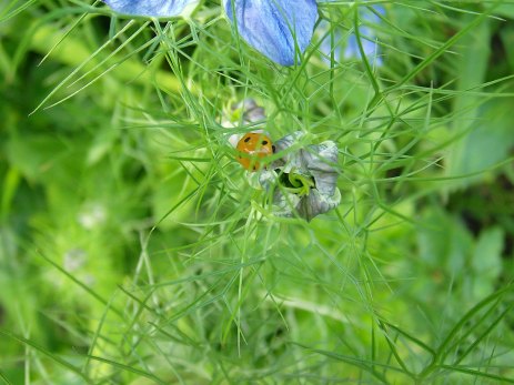 Von diesen Winzlingen saßen einige an der Nigella. Dieser hier ließ sich weder von den wütenden Ameisen, die ihre Blattlaushonigplantage in Gefahr sahen, beeindrucken, noch von der ständig piepsenden Kamera.
