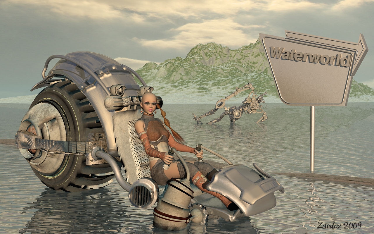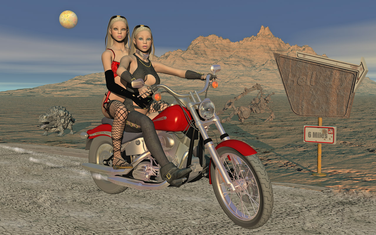 Poserfiguren in Poser erstellt und dann nach Bryce importiert. Die Texturen vom Bike habe ich größtenteils in Bryce erstellt. Langsam habe ich den Import von Poser nach Bryce im Griff.