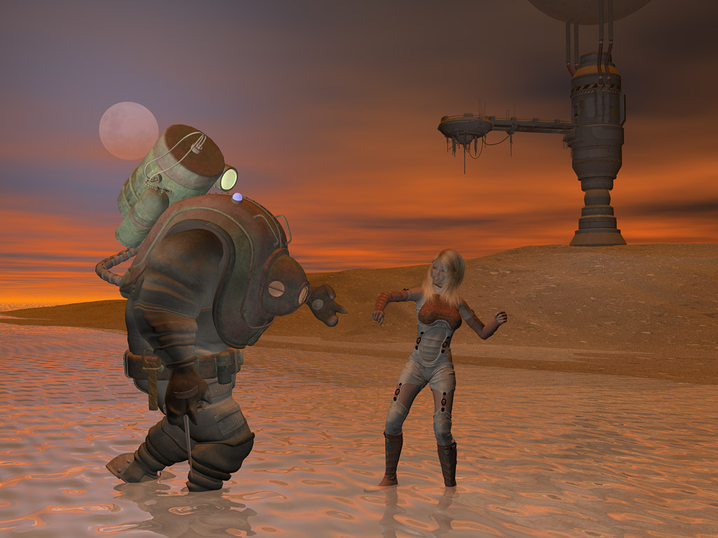 Die Poserfiguren habe ich in Poser7 erstellt und dann nach Bryce exportiert/importiert. Die restliche Scene habe ich in Bryce erstellt.
