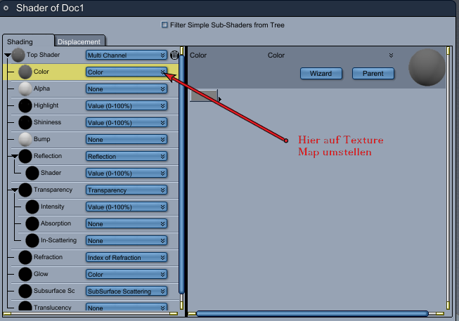 So dann [edit new master Shader] in [Edit]Dann kommt Bild1 (Color auf Texture Map umstellen)