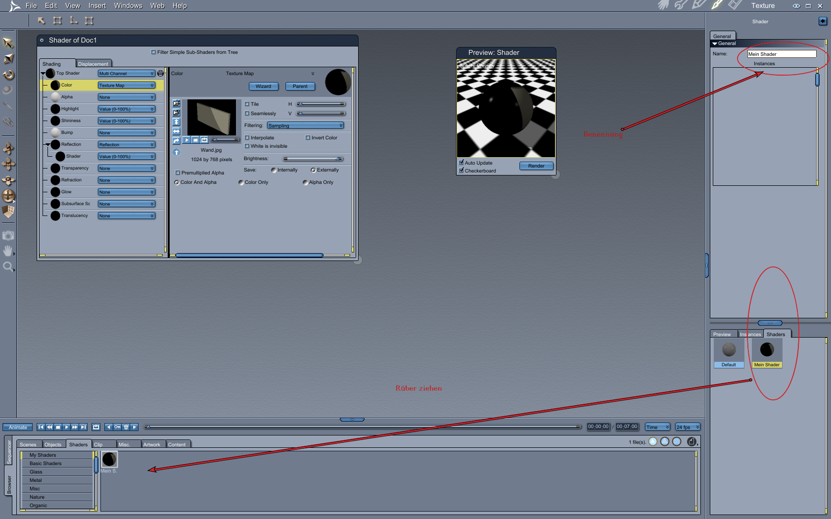 Unter General kann man jetzt den Shader umbenennen unt aus shaders einfach in den Browser ziehen und schon ist er abgespeichert.