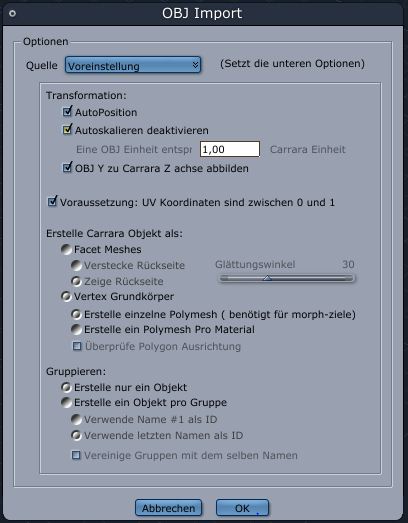 Also generell ist das Objekt ein ganzes. Mit doppelklick kann man es noch bearbeiten in Carrara. Andere Imports dagegen waren in Einzelteilen. Das kommt wohl auch auf das Objekt selber an was man Exportiert/Importiert. So weit bin noch nicht vorgedrungen. Dann haben die einen die Textur mit genommen, andere wieder nicht.
