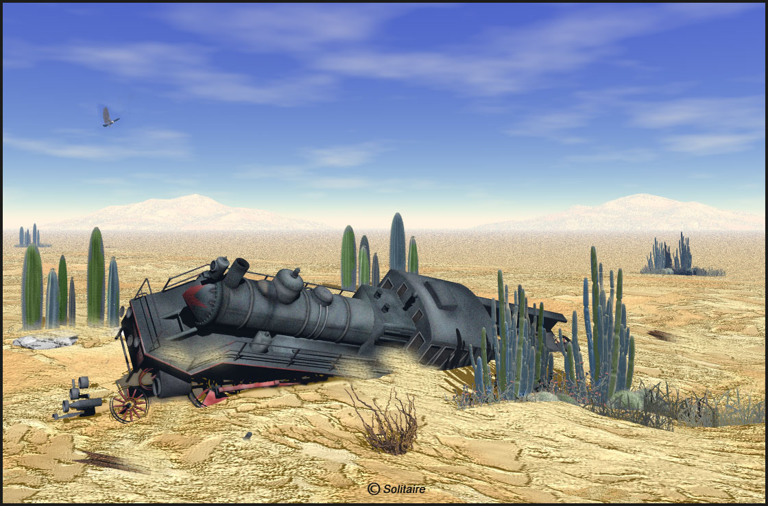 Hab mal wieder etwas mit Bryce gespielt, dabei ist dieses Bild rausgekommen. Ihr braucht euch keine Sorgen machen, das Unglück ist schon lange her, der Zug war leer und der Lokführer wurde von einer Karawane gerettet und ist heute stolzer Opa von 30 Enkeln *lach*