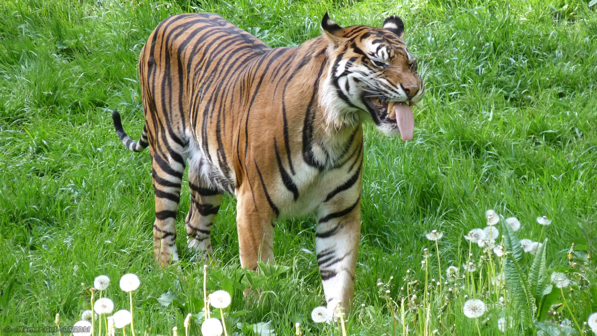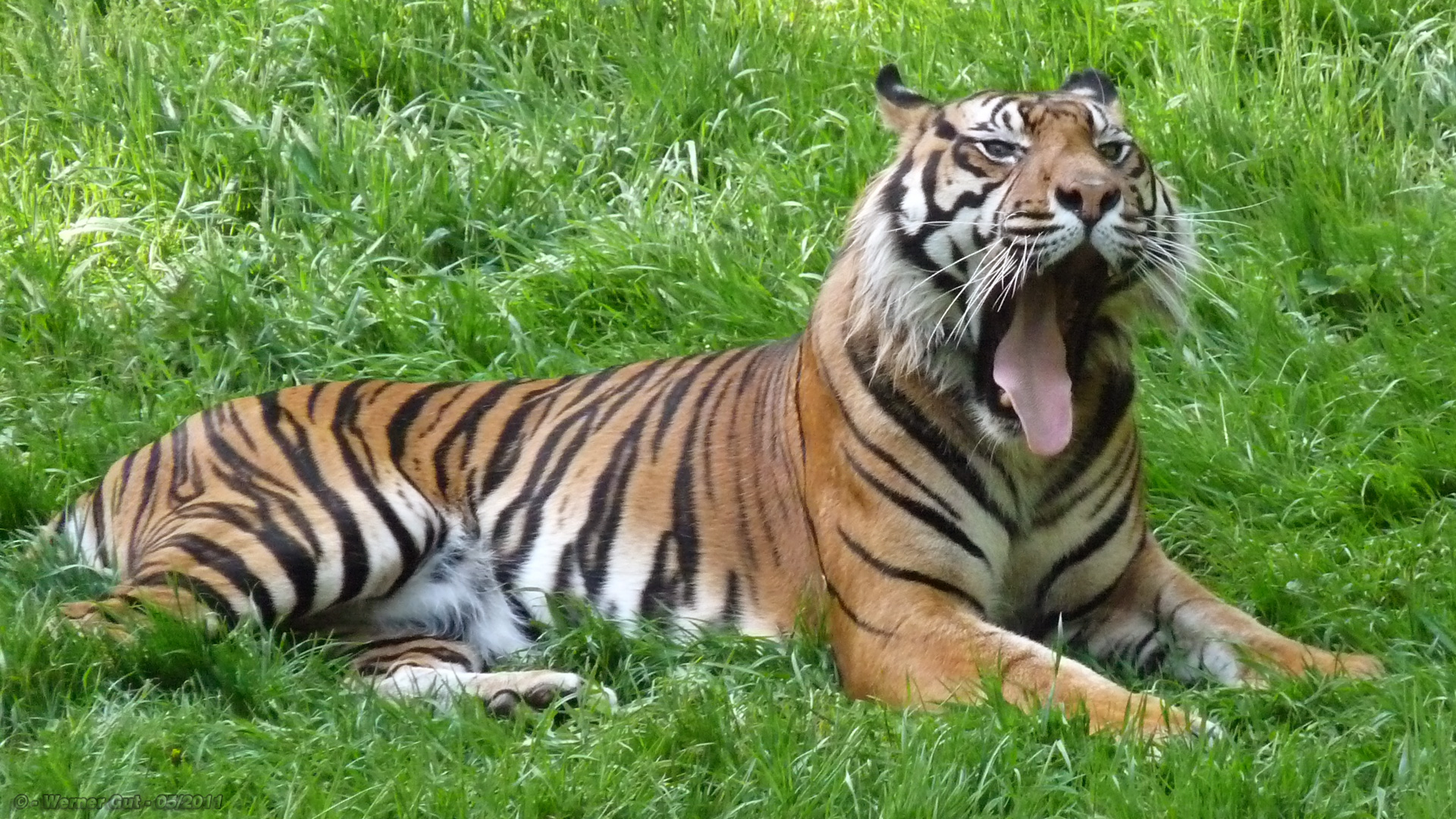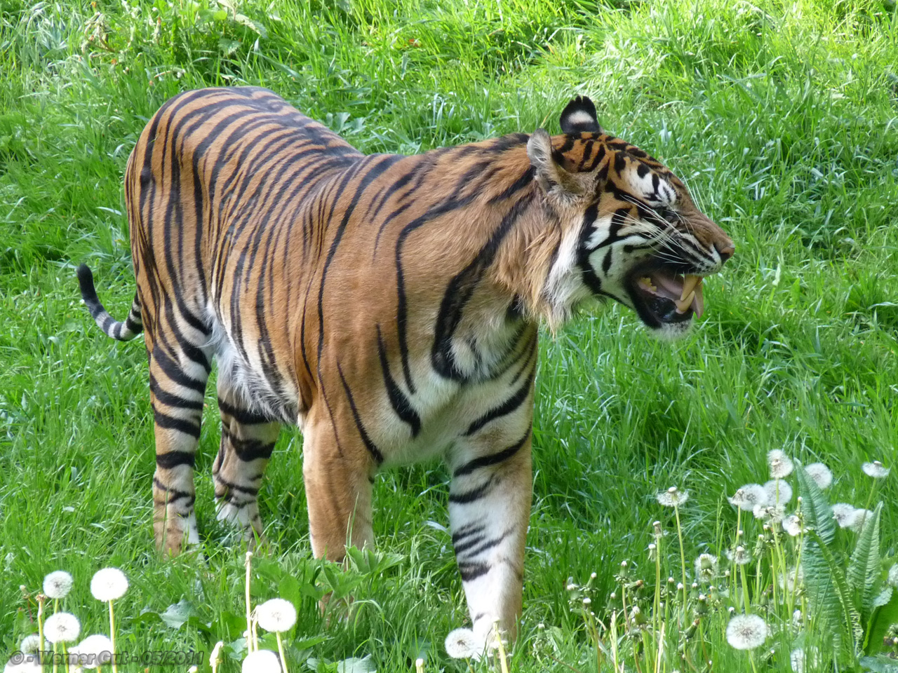 Erst einmal ein Foto vom Sumatra-Tiger gemacht. Wenn dann nämlich die Besucher unterwegs sind verzieht er sich meist lieber wieder in sein Innengehege, wo ich ihn aber nicht so fotogen finde.