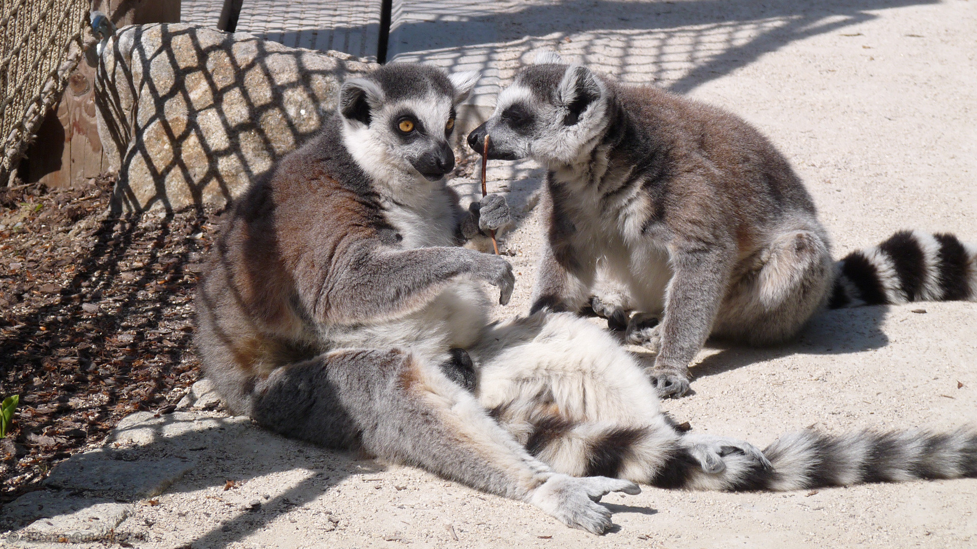Die Kattas sind ähnlich den Erdmännchen - immer in Bewegung. Außer.... Ja, außer es hat gerade was zu fressen gegeben. Da liegen sie dann auch lieber im Schatten und verdauen.