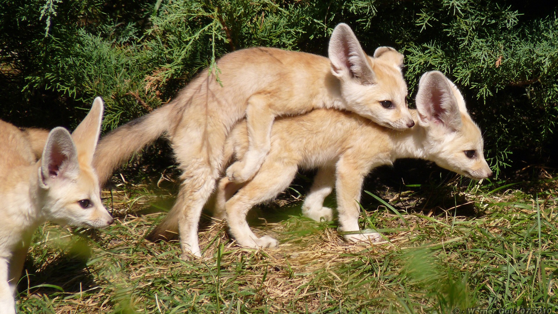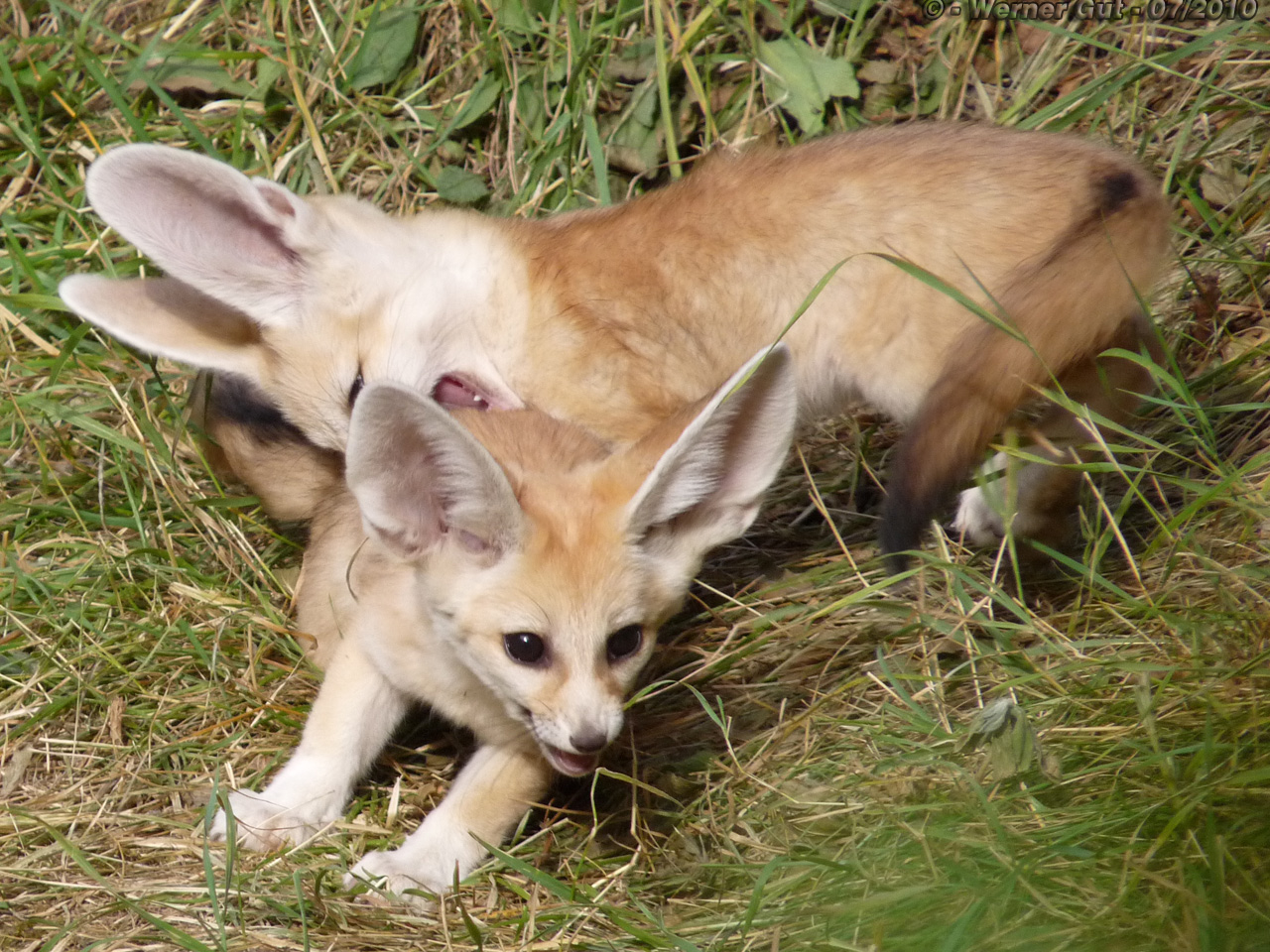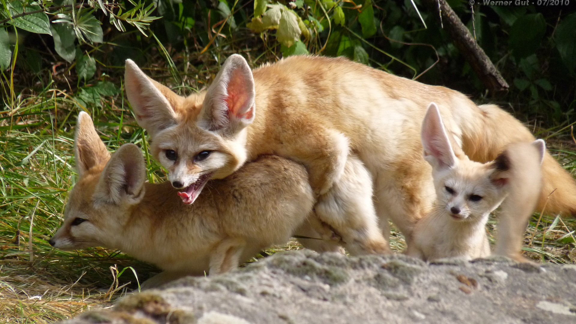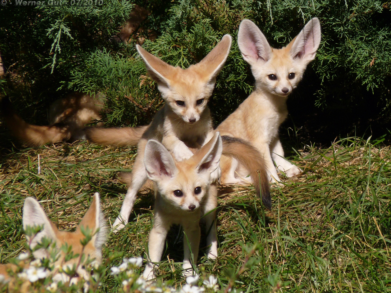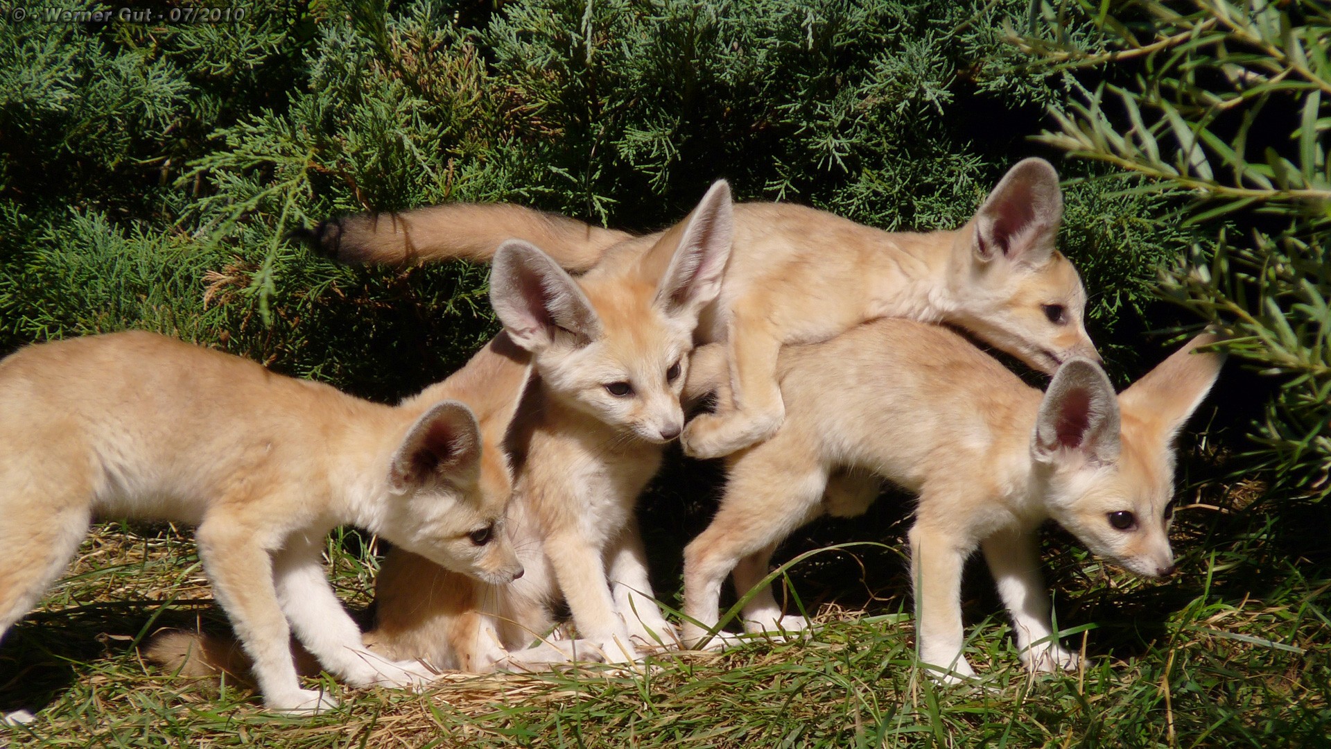 Bei den Fenneks hat es gleich zwei Würfe gegeben. Wie viele Jungtiere es jetzt insgesamt sind wissen selbst die Pfleger noch nicht genau. Die Vermutungen schwanken zwischen 8 und 9! Genaueres können sie erst sagen wenn die kleinen groß genug sind um geimpft zu werden. Dann wird man sie erst wirklich durchzählen können. Im Moment ist das noch nicht möglich, da die kleinen sich partout nicht in einer Reihe aufstellen wollen um sie zu zählen.