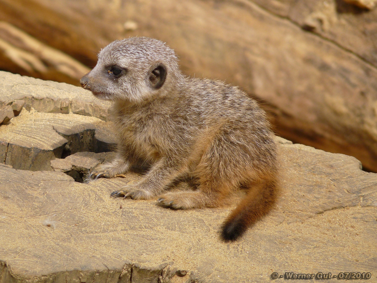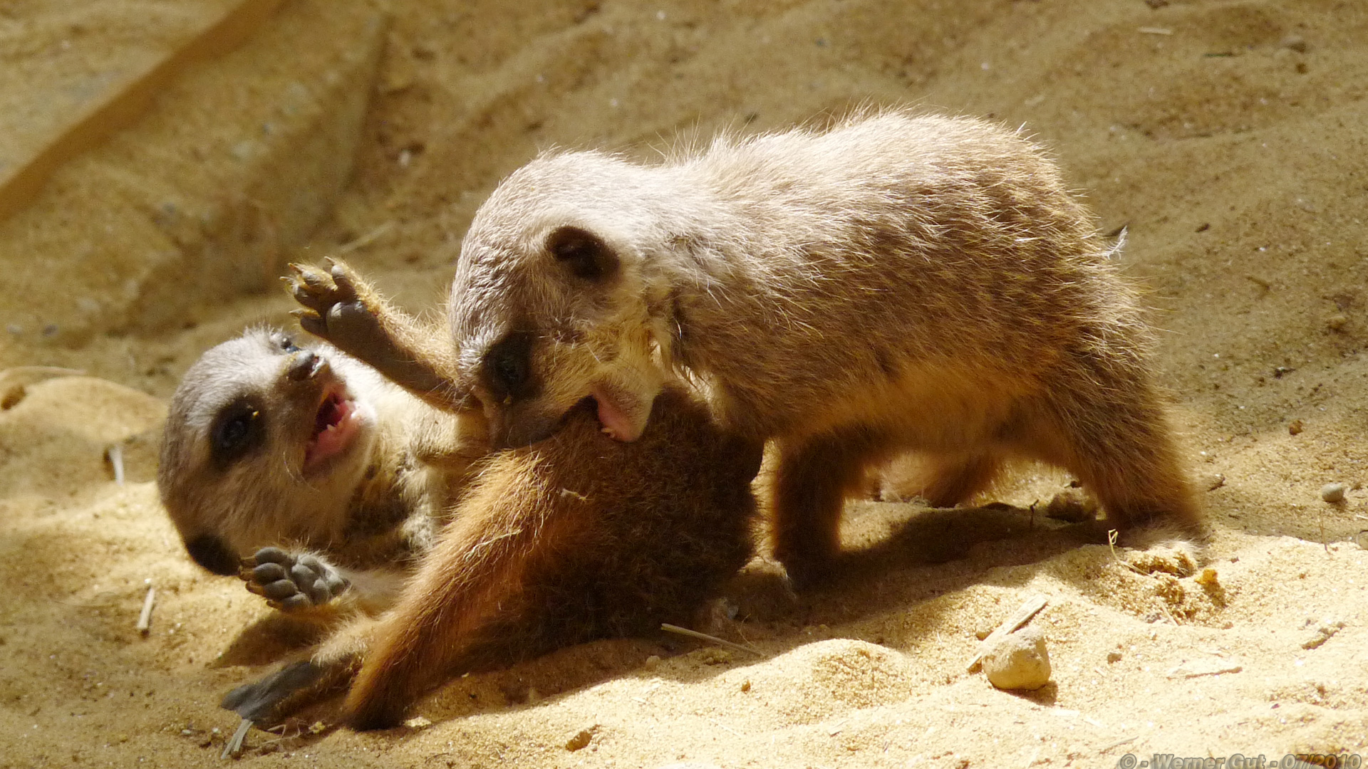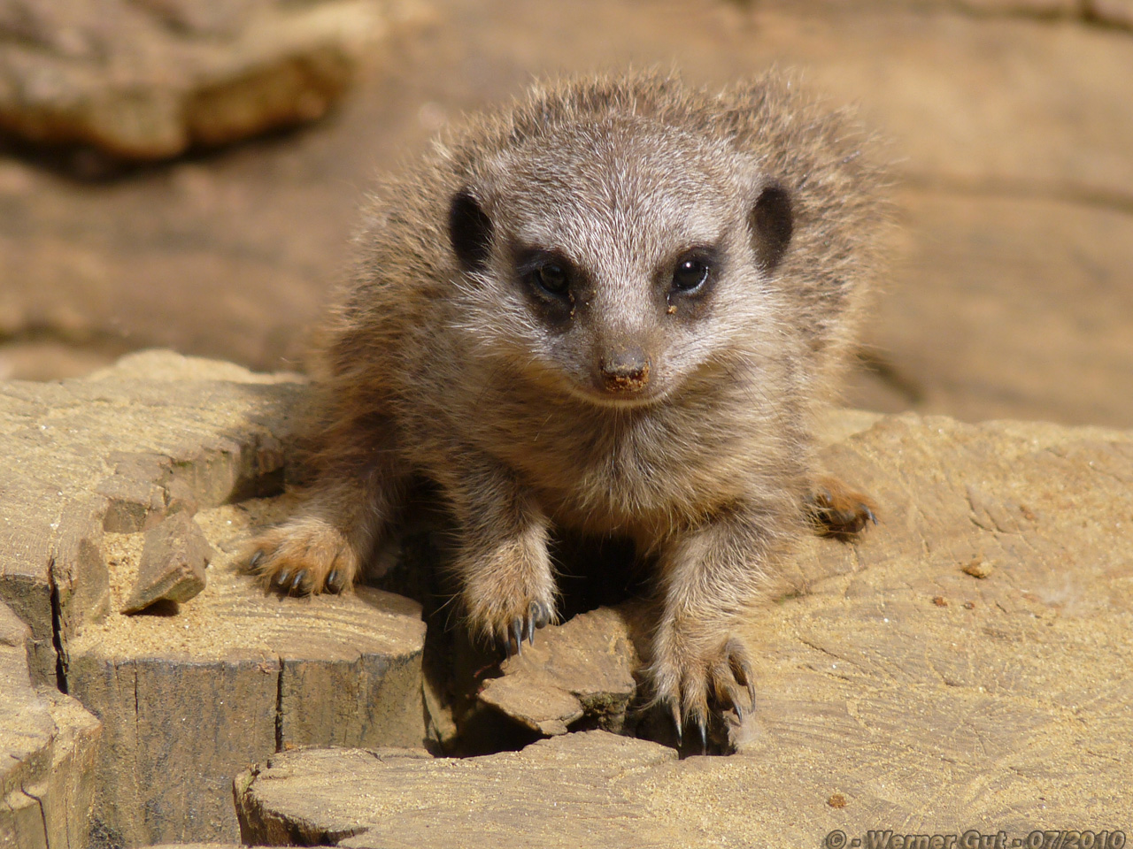 Doch die Erdmännchen waren nicht untätig und haben schnell wieder für Nachwuchs gesorgt. Die sind nun so weit dass sie ihre Höhle verlassen und durch das Gehege tapsen.
