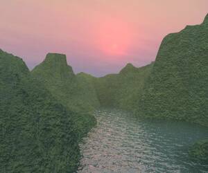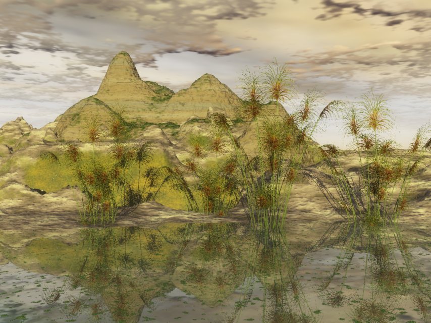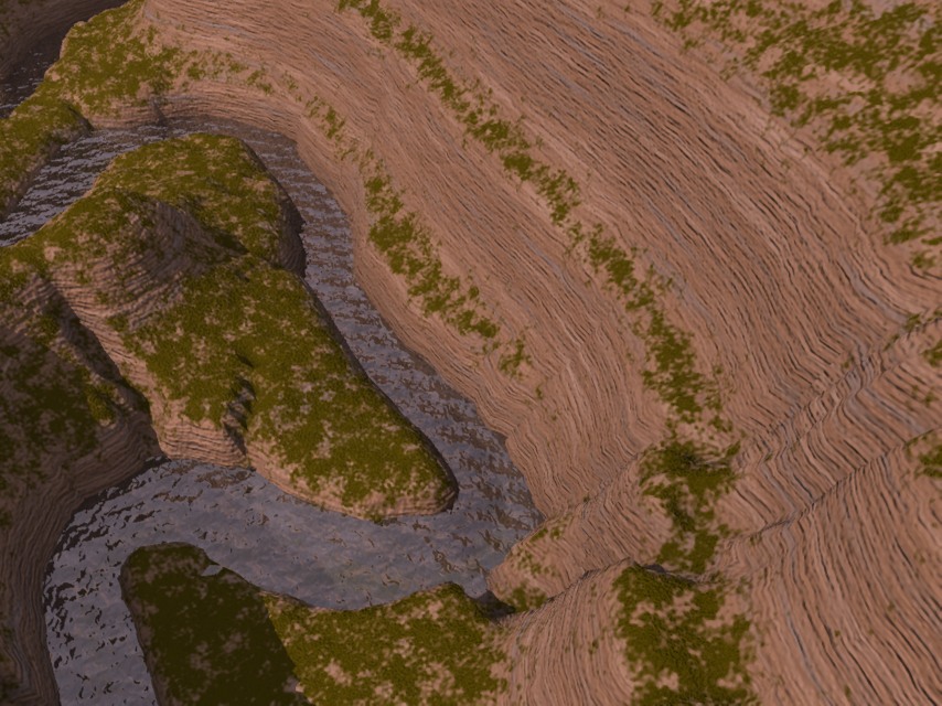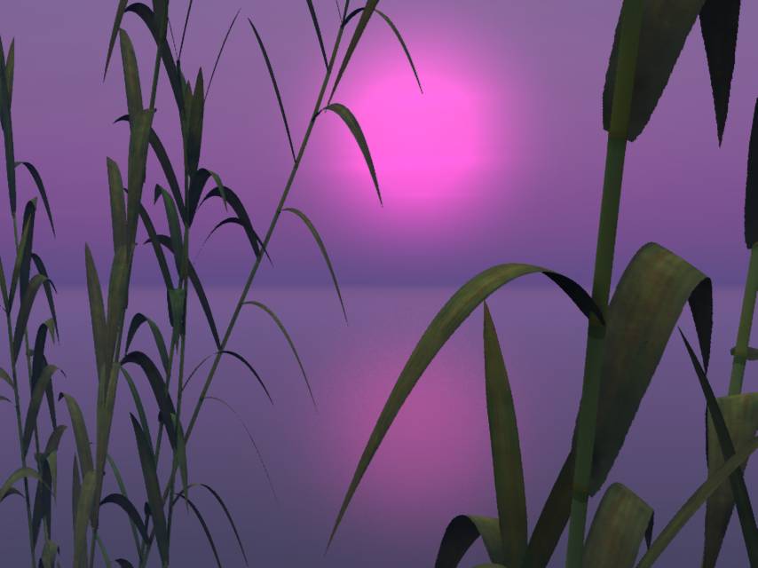 Das Gras würde ich eher mit einem lattice im Geländeeditor erstellen, vielleicht etwas schräg und wellig, wie vom Wasser bewegt.Sieht so etwas statisch aus.