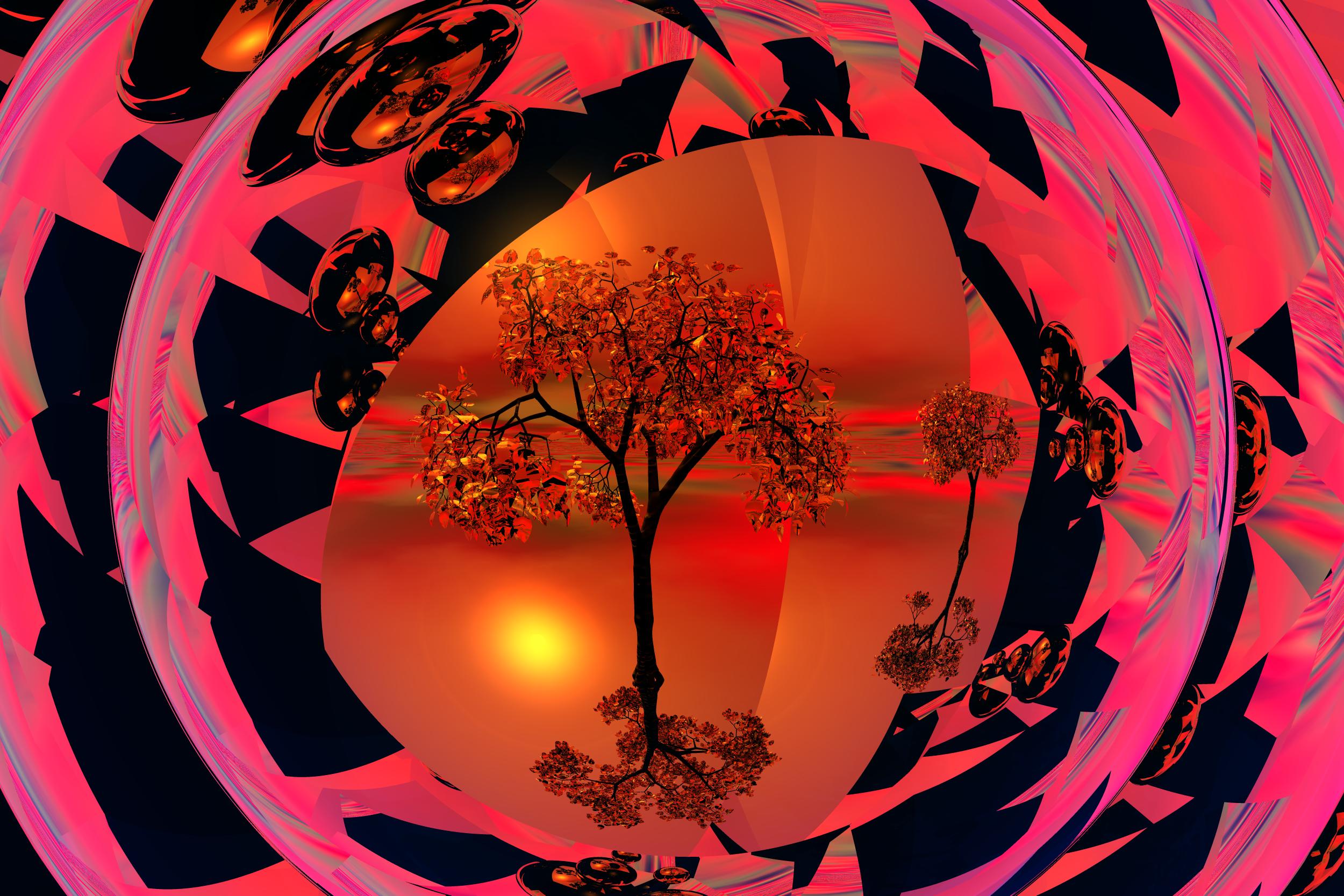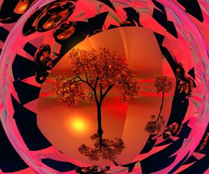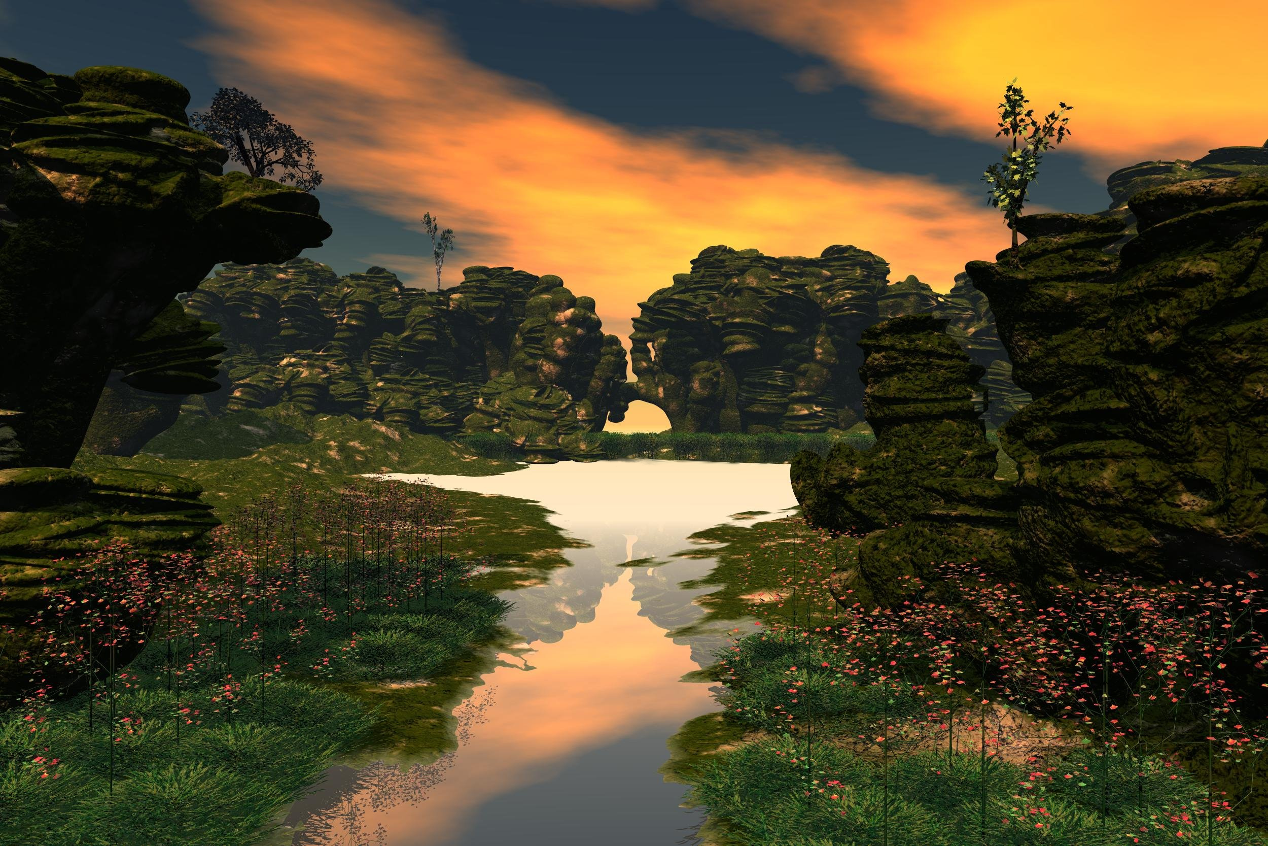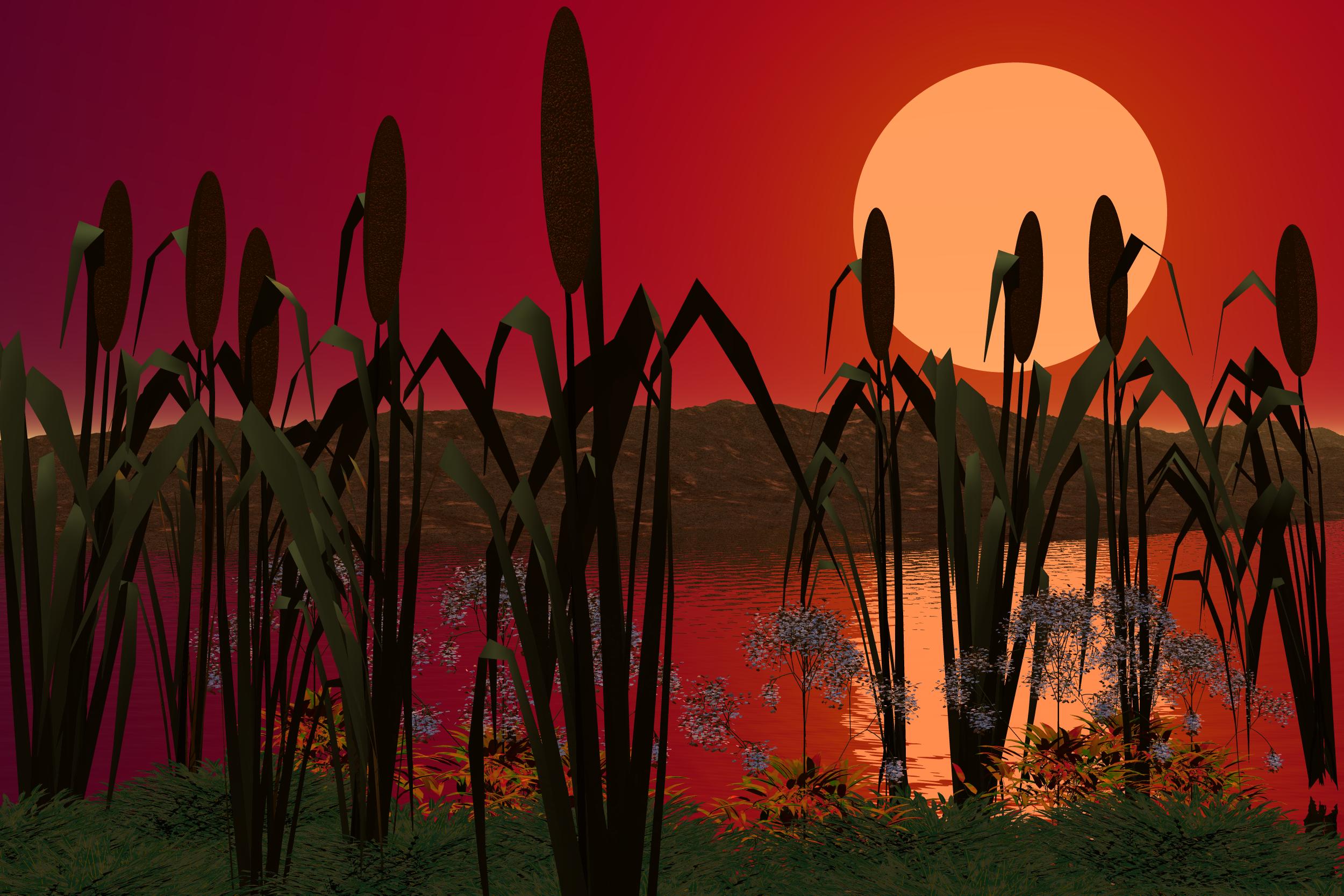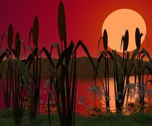 Ne kleine sunset-Szene...mit forgetmenot aus dem tree-Editor...und Rohrkolben...einer Mischung aus Baum, Kugel und Grass aus den presets von bryce 5.5