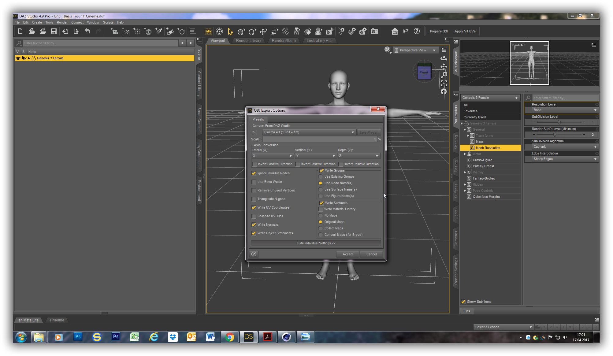 Für den Export der OBJ aus dem DAZ Studio gibt ja die Einstellungsmöglichkeiten des verwendeten Modellingsprogramms (wie von DS vorgegeben) Cinema 1 unit = 1m, dann springt Scale automatisch auf 1 % (anstelle von 100 %?) und ich kann unter den individual Settings nicht mehr Write Material Library anhaken. Warum weiß ich nicht? siehe bitte nachfolg. screen: Gn3F_OBJ_Cinema.jpg