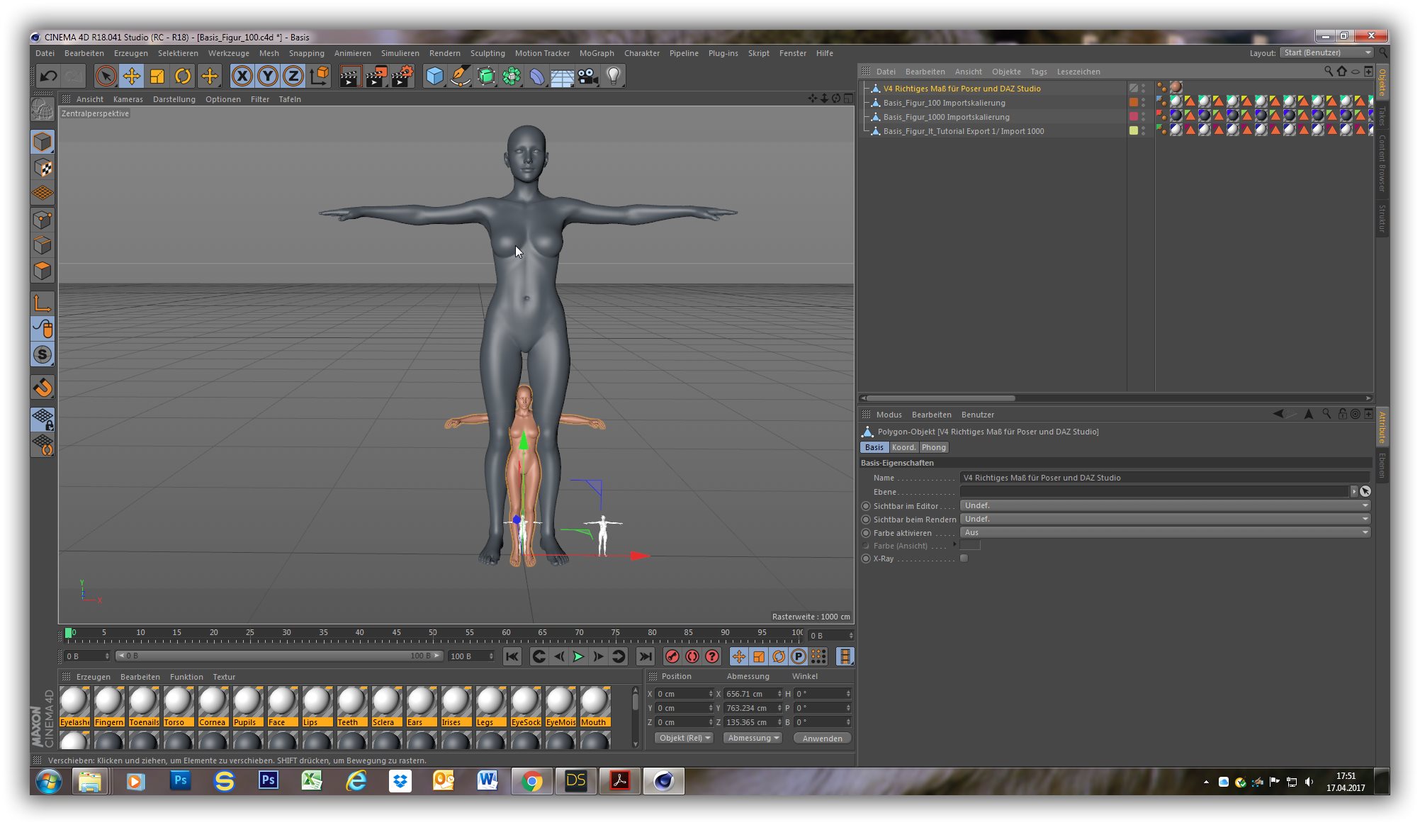 Wenn ich dann die Genesis 3 Female mit Riptide Pro in Cinema lade, dann wird die Genesis 3 Female entweder winzig klein oder riesig in mein Arbeitsfenster (je nachdem wie hoch ich den Importskalierungsfaktor in Riptide Pro eingebe) geladen. Ich hatte bisher für die V4 aus Poser einen Importskalierungsfaktor von 1000. Um festzustellen, ob ich die richtige Größe der Genesis 3 Female Figur für das Modelling habe, habe ich zum Vergleich meine bereits für das Modelling verwendete und richtige skalierte V4 (in braun) in Cinema dazugeladen (die ich bisher für Modelling in Cinema benutzt hatte) und kann daran erkennen, daß - egal, welche Größe ich auch als Riptide Skalierungsfaktor für die Gn3F OBJ für Cinema benutze - diese Gn3F-OBJ nicht die richtige Größe haben kann... siehe nachfolg. Screen: Cinema_Import_Gn3F_OBJ.jpg