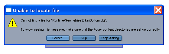 DAZ findet die bekleidung nicht, so wie ich die Fehlermeldung verstehe. Ich habe sie dann gesucht aber finden konnte ich in den Poserverzeichnisse nichts. Ausserdem suchte er nach Obj-dateien.