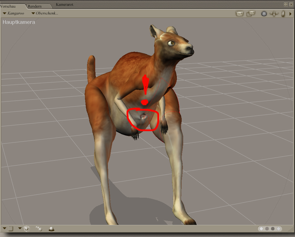 Und wie gesagt, ich habe am Känguru nichts skaliert. Habe sogar noch kontrolliert ob dieser Körperteil einen Skalierungswert unter 100% enthält. Ist aber nicht der Fall. Wahrscheinlich ein Fehler am Mesh.
