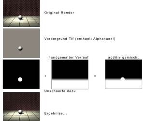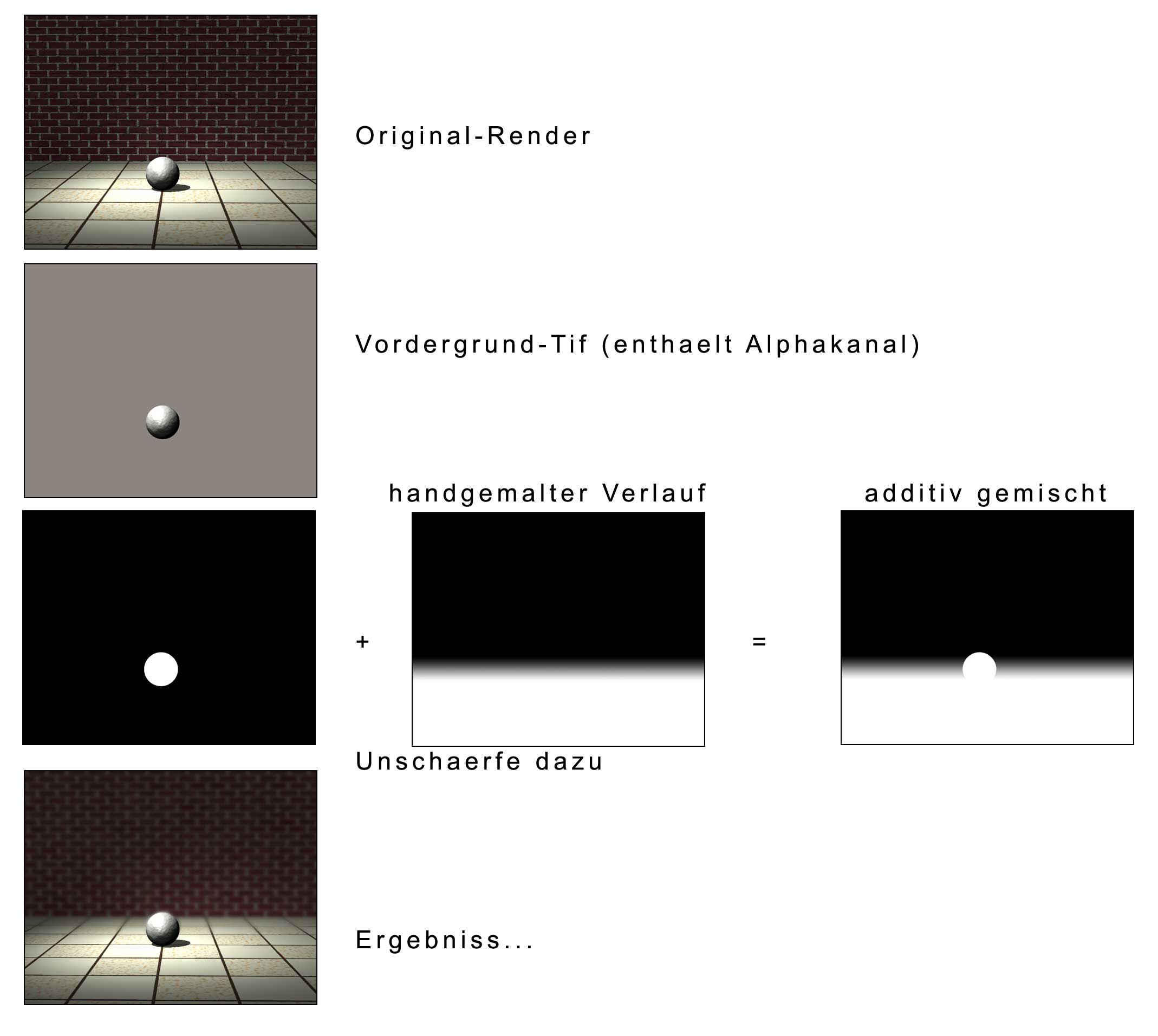 in poser4 muessen dafuer die objekte separat herausgerendert werden, die im vordergrund sind (alle hintergrundobjekte unsichtbar machen). das ganze renderst du als tif- oder tga-sequenz heraus. poser integriert im normalfall einen alphakanal (sprich maskenkanal) in das bild, der dann im comp benutzt wird. danach sollte der hintergrund gerendert werden. beide sequenzen laedst du in ein compositingprogramm deiner wahl. da jetzt VG und HG voneinander getrennt sind, kannst du dem HG etwas unschaerfe hinzufuegen oder auch ein wenig helligkeit und saettigung veraendern. fuer den boden koenntest du dir einen "handgemalten" verlauf basteln und diesen additiv mit der VG-maske mischen. mit dieser maske kannst du dann die unschaerfe fuer den HG steuern.