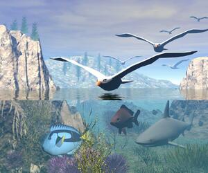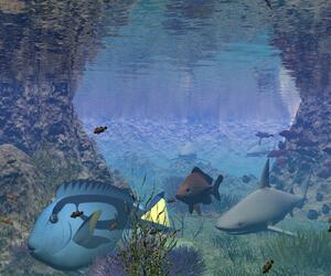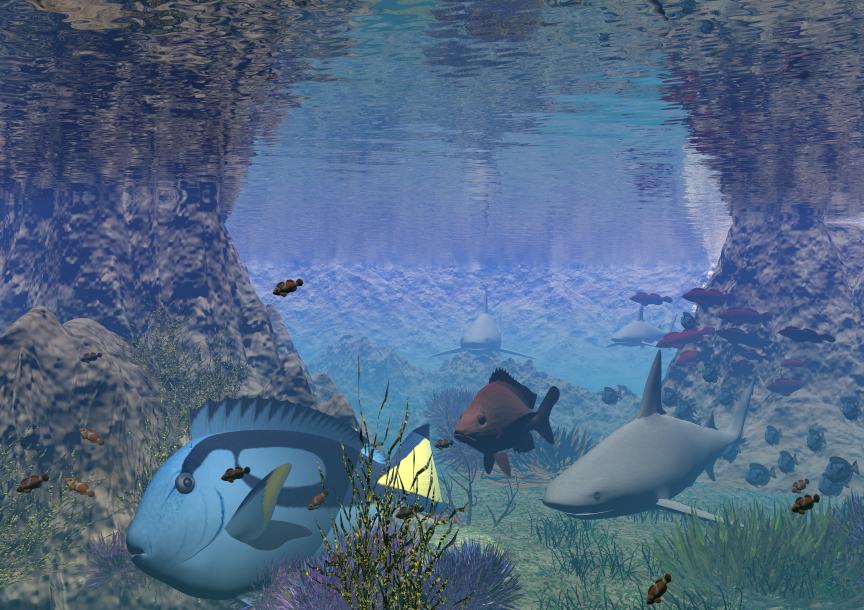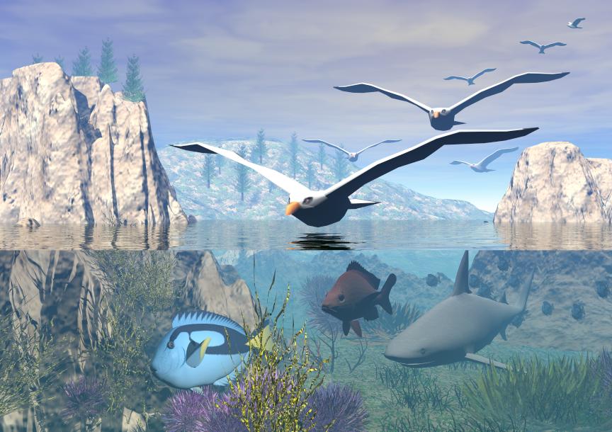 Bei Bild 1 habe ich den Fisch im Vordergrund verkleinert (der arme Kerl hatte zwischen Waseroberfläche und Meeresgrund wirklich kaum Platz zum Schwimmen) und den Dunst unter Wasser ein wenig erhöht, damit es "wässriger" ausschaut.