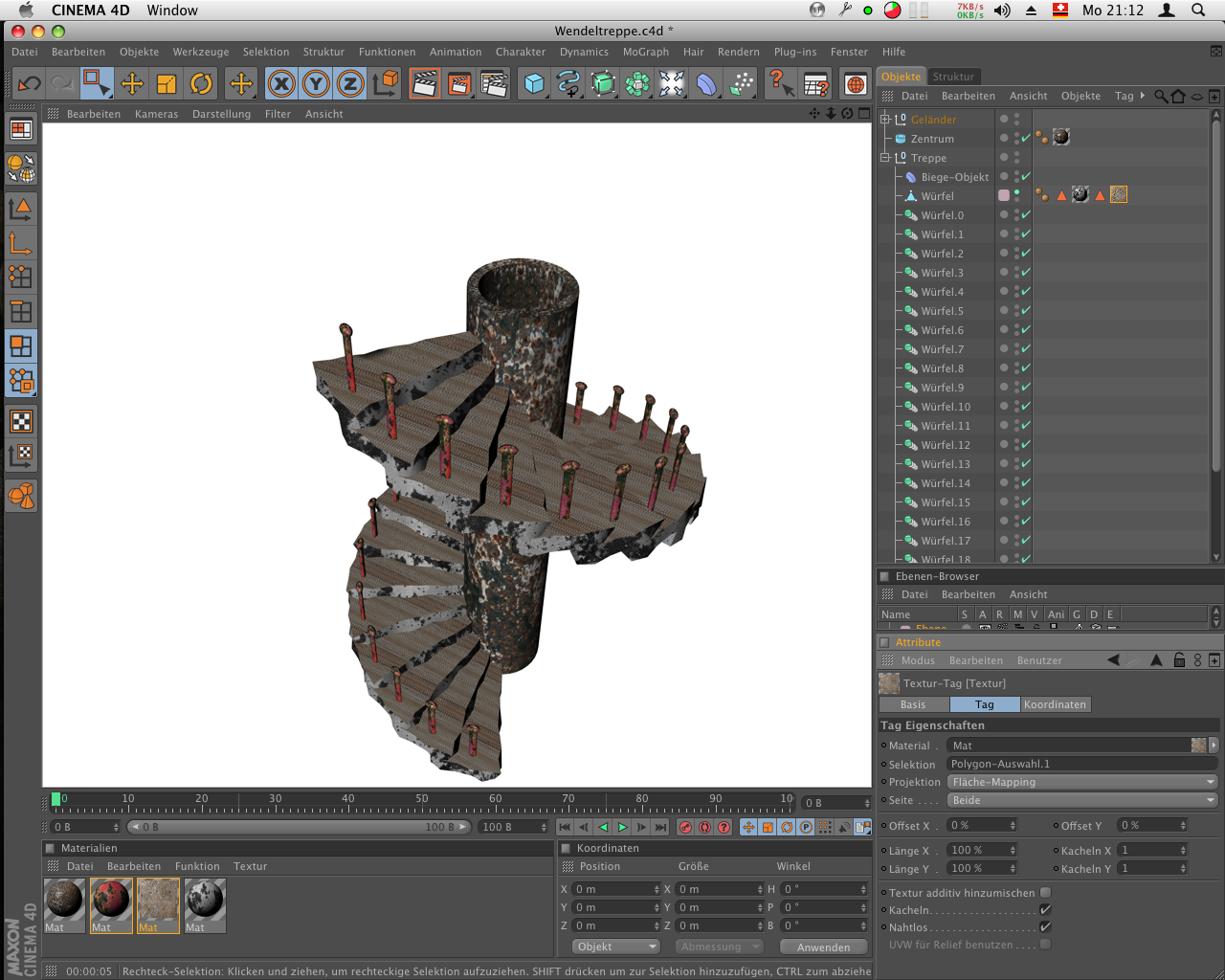 Also, ich habe mir mit viel Aufwand eine Wendeltreppe gebastelt. *schwitz* Aber die Texturen sehen einfach nach nix aus. Vor allem die Treppenoberseite. Das ist eigentlich ein Blech mit Rippen drauf (rutschsicher) aber das wird überhaupt nicht dargestellt. Auch weiss ich nicht wie ich da Geländer fertigstellen soll.