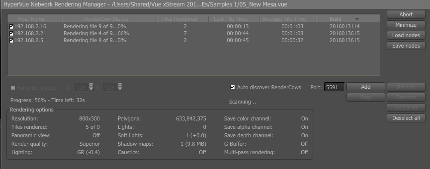 Ok, jetzt habe ich auch noch das gemischte Netzwerk mit einem Win7-Laptop ausprobiert, und es scheint eigentlich gut zu klappen. Hatte zuvor noch keine Rendercow auf diesem Windows installiert gehabt, aber ich musste lediglich eine extra Freigabe für die Firewall-Software machen, damit der gewünschte Port für die Kommunikation benutzt werden konnte. Beim Haupt-rechner hatte ich das automatische Scannen eingeschaltet und es wurden alle laufenden Kühe gefunden und die Tiles abgeholt. Von wegen Ordner freigeben musste ich nichts ändern. Ich denke aber auch, dass die Kommunikation der Rendercows übers Netzwerk hier kein Problem darstellt, weil wir die Cows ja selbst als angemeldete User installieren und starten. Auf dem Screenshot ist der Windows-PC Nummer ..5 in der Liste, was man sonst nicht wüsste.