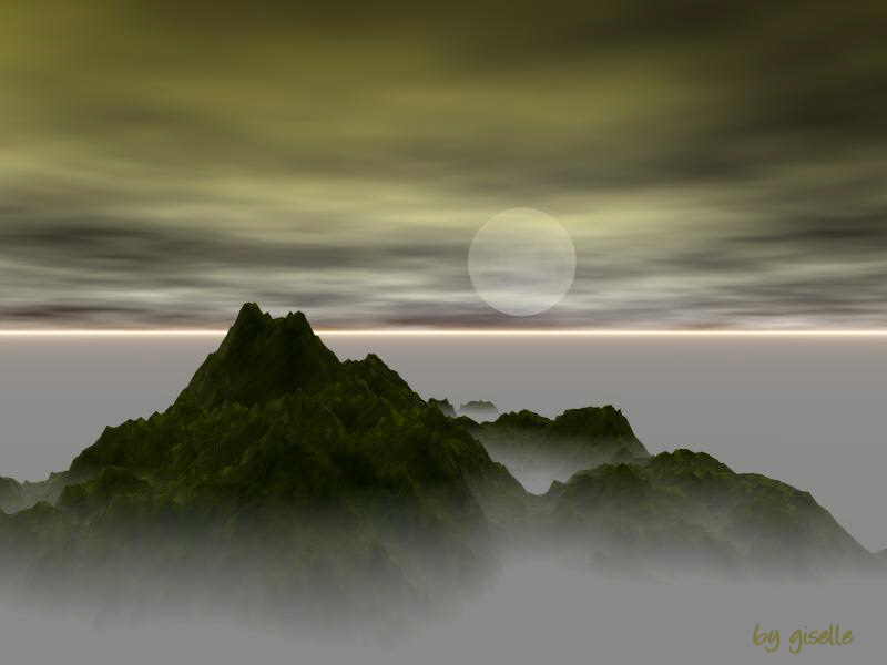 Hier nun 3 neue Versuche, Landschaften zu gestalten. Alles auf dem Bild ist von mir zusammengesetzt, nichts übernommen, also: Himmel, Berge, Nebel, Licht ... ich habe einfach drauflos gerädelt und was mir gefiel, habe ich behalten. Nur den Regenbogen habe ich nicht gesehen. Warum ist er nicht erschienen?