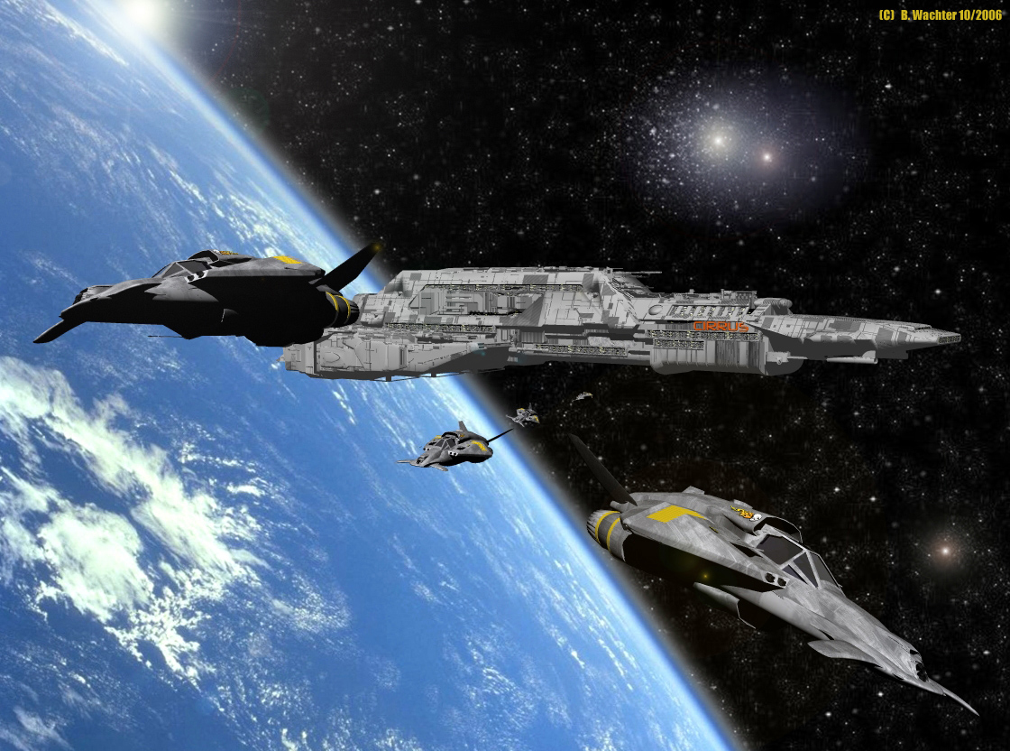'N spaciges Pic, gefällt mir! Einziges Manko (ist aber nicht deine Schuld): Die "Erkundungsflieger" sehen am besten unscharf aus, da sie sich ja schnell bewegen. Aber leider hat Bryce keinen Motion-Blur (im Gegensatz zu Vue ;)).