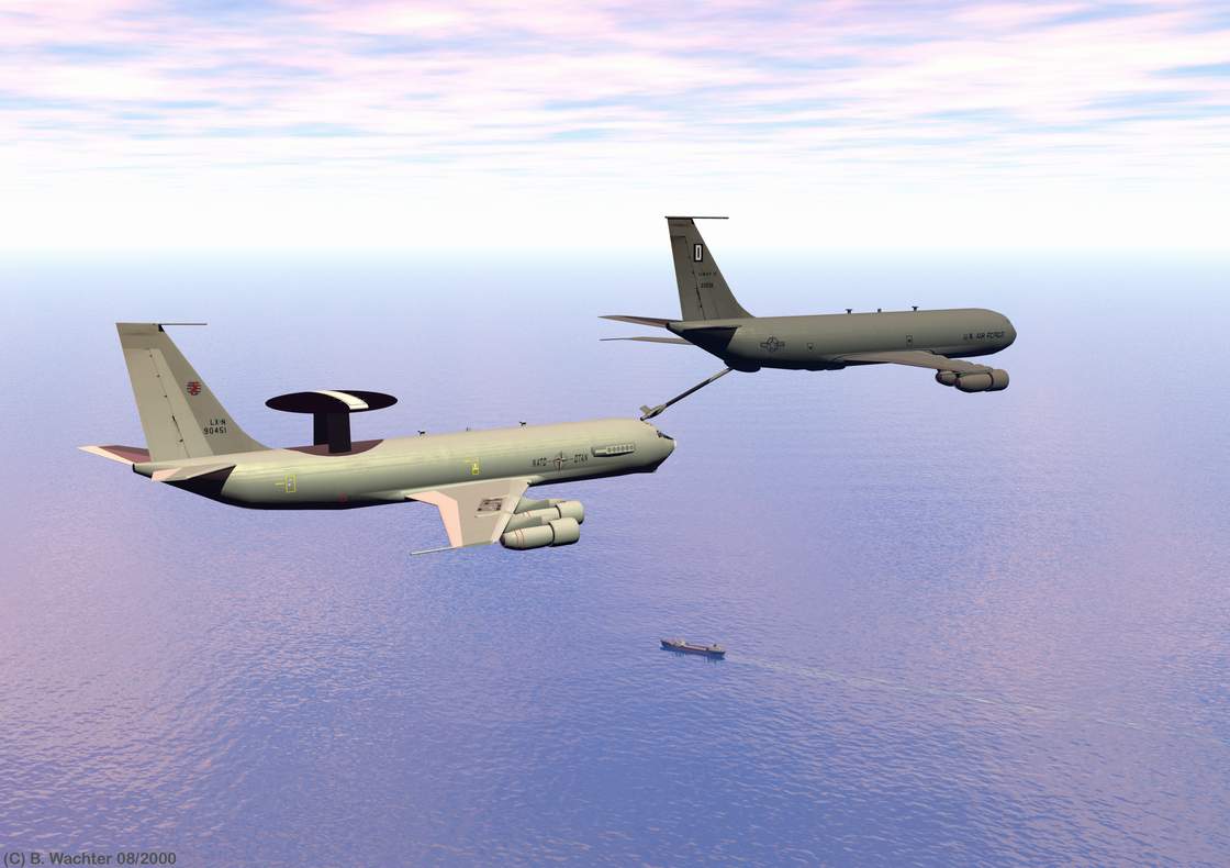Die Modelle sind verbesserte Freebees und den Tanker KC135 habe ich aus der E3A gebastelt. Die Texturen habe ich zum Teil mit Corel Draw gezeichnet und zum Teil mit Photoshop erstellt. Das Leitwerk der AWACS Maschine ist aus einem selbstgemachten Foto entstanden ebenso das des Tankers. Details habe ich später im Postwork mit Photoshop eingearbeitet. Leider sitzt der Radarpilz etwas zu niedrig und die Leitwerke sind einen Tick zu klein geraten. Wer´s nicht weiß merkts aber wahrscheinlich nicht.