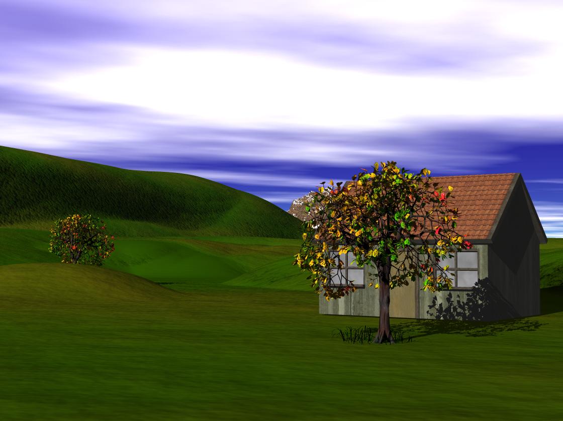 ZUm anderen erscheinen die schatten AUF der Hütte sehr hart und pechschwarz, das problem konnte ich bisher nicht lösen. den schatten den das Objekt auf den Terrain wirft wirkt jedoch normal "mittelgrau" und recht realistisch weich.