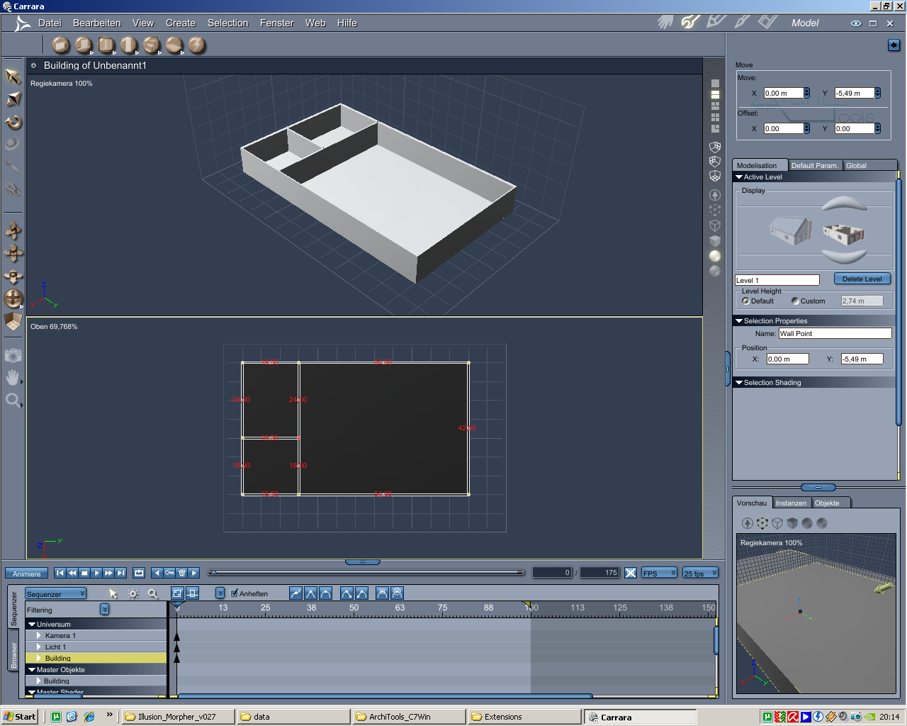 Fazit: Eine Bereicherung für Carrara wenn man reine Gebäude erstellen will, für andere funktionalitäten scheint es nicht weiter geeignet zu sein, ausgefallene Häuser in runder Form kann man leider nicht erstellen (zumindest habe ich auf den ersten Blick nichts gefunden, evtl eine Einschränkung der Demo-Version). Also momentan leider nur die klassische Form eines Hauses möglich, allerdings hat man im Inagoni Forum ein Schloss kreiirt, evtl ist es doch in der Vollversion möglich.
