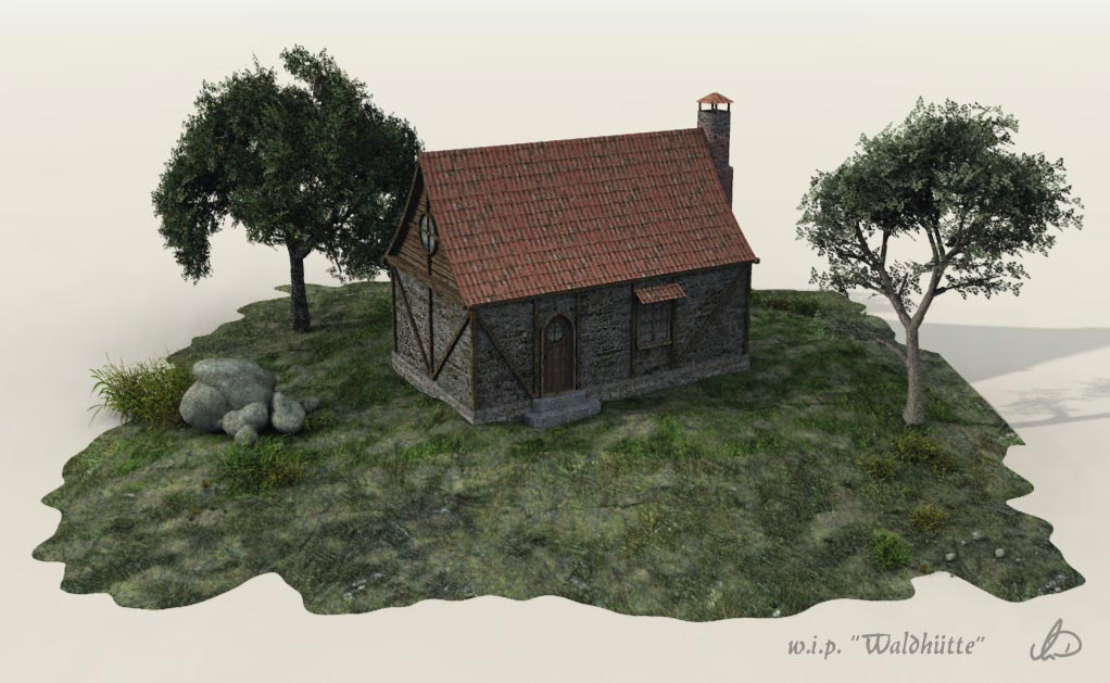 Das Rendern der Hütte erfolgte wieder in Cinema. Ebenso fertigte ich noch ein Testrendering in Vue an, mit simpler "Final"-Einstellung, um zu schauen, wie es mal zukünftlich in einer Szene aussehen könnte.