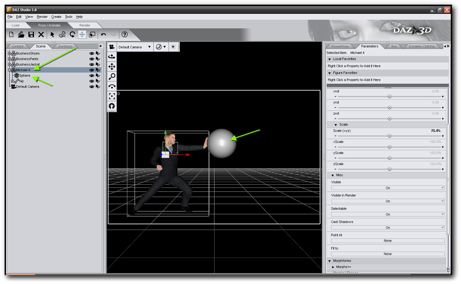 Möglichkeit 1: Nur die Hauptfigur im Scene Tab markieren und im Parameters-Tab verkleinern. Die Bekleidung verändert sich mit.