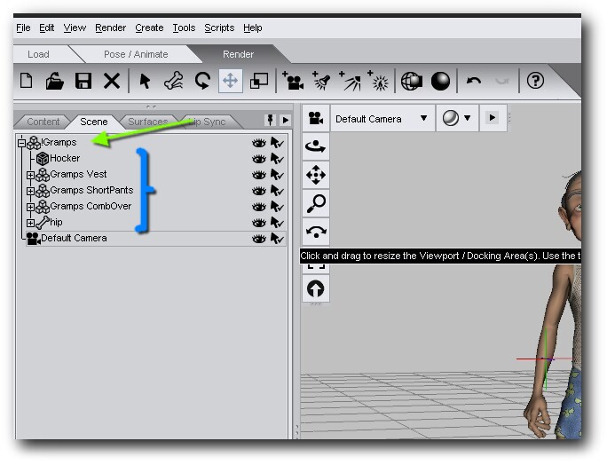 Tipp: Wenn Du eine Figur z.B. auf einem Hocker setzt oder einen Gegenstand in die Hand gibst und die Figur samt Gegenstand verschoben werden sollen, dann kannst Du einfach im Scene-Tab die Figur/Gegenstand mit der linken Maustaste anfassen und auf das Objekt/die Figur ziehen, die Du zusammen gruppieren möchtest. Sie legt sich dann in die Unterstruktur als Kind-Objekt.