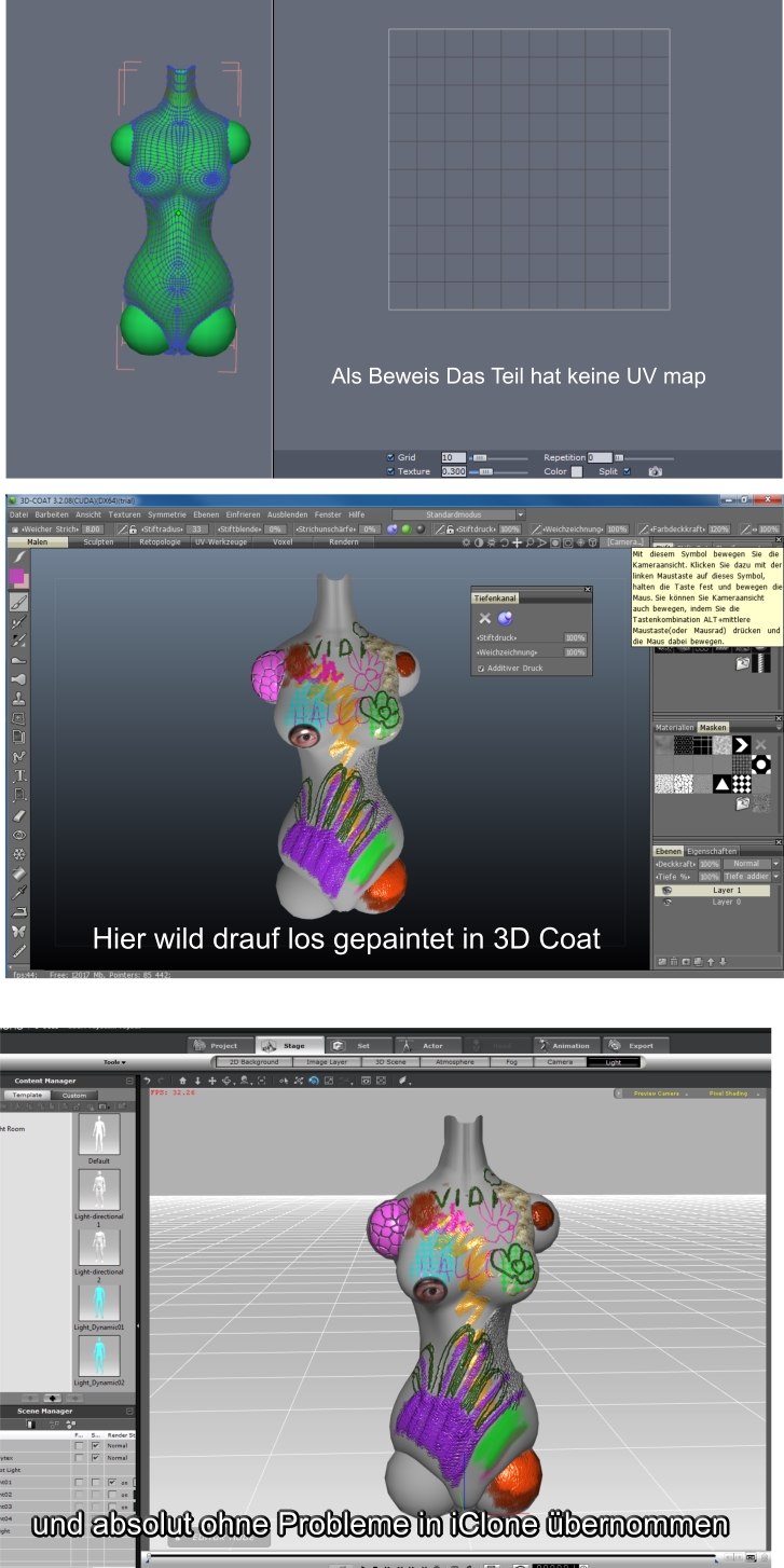 Ist das was Neues ? oder eine alter Hut ? ich habe gerade mal dieses Pixelpainting ausprobiert und find das ja mal mega interssant , da man sich wohl in Zukunft das unfolden sparen kann. Auch ohne UV map kann man da sauber malen und alles mit Spec und Normalmap inklusive .Hier mal ein Shoot aus Hexagon nach 3D coat und dann nach iClone . In iClone kann man mit den Normalmapps jede menge Detailiefe herausholen Auch sonst gibt es soviele tolle Malfunktionen schon allein dafür hätte sich der Preis gelohnt. Ich bin nur noch begeistert von dem Teil.