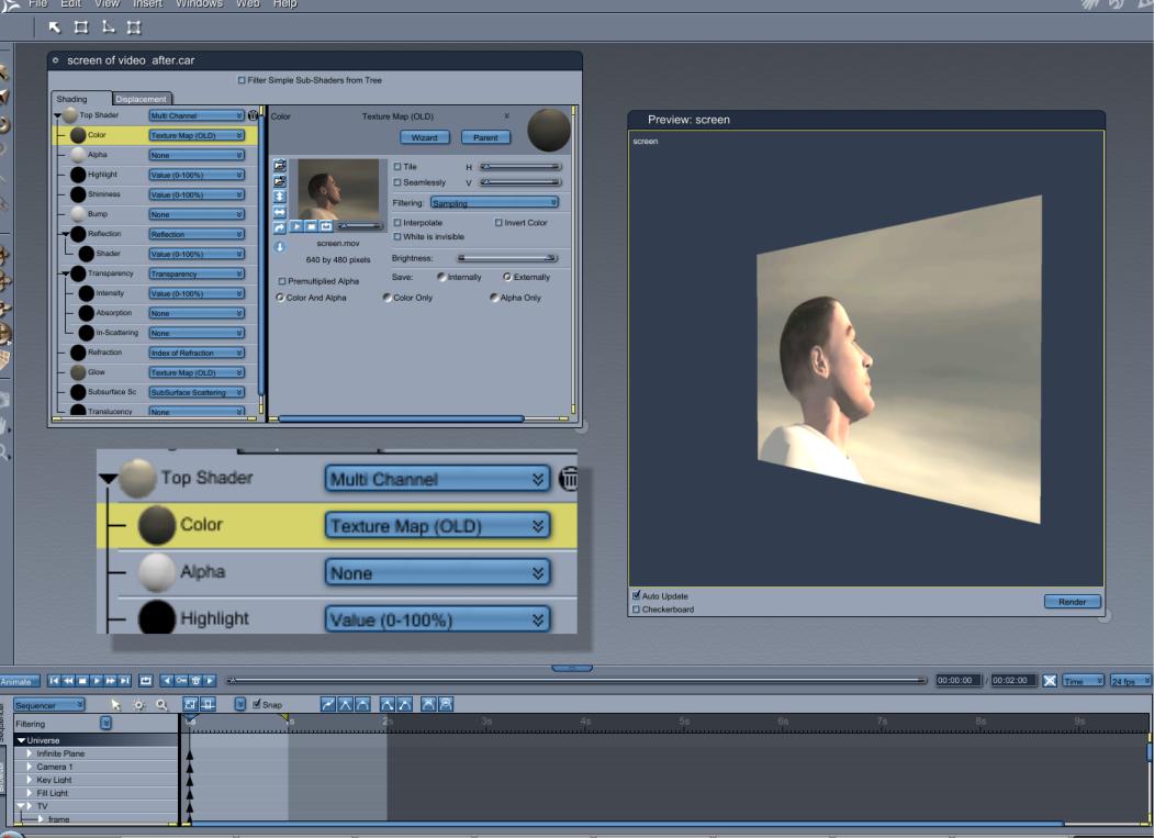 Also ich weiß nicht woran das liegt aber bei mir funzt das nicht . Komischerweise wenn ich das TutorialFile von Jack Withney lade (Ein Fernseher mit Movie) dann geht das einwandfrei , aber sobald ich das selbe nachstellen will funktioniert die Movie Animation(Textur) nicht mehr . Auch steht beim Jack Withney File im Shaderroom Texturmap (old).