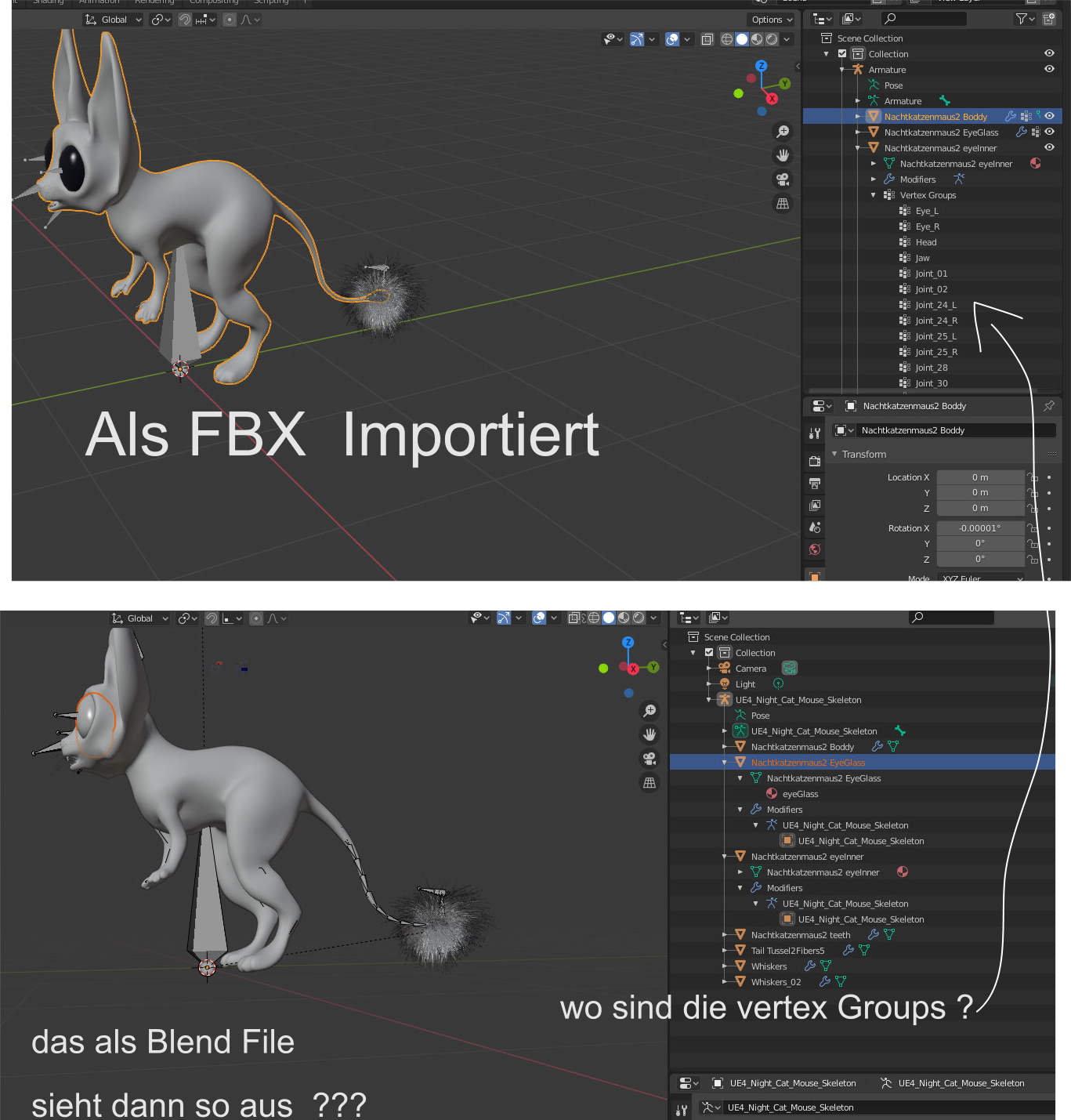 Was ich nicht verstehe, wenn ich in Blend File speichere, warum die Vertex Groups gelöscht werden und der Orgin dann verschoben ist und somit das File unbrauchbar wird. Man muss echt für das native Format die Modifier applen wenn man das saven will, das macht ja gar keinen Sinn