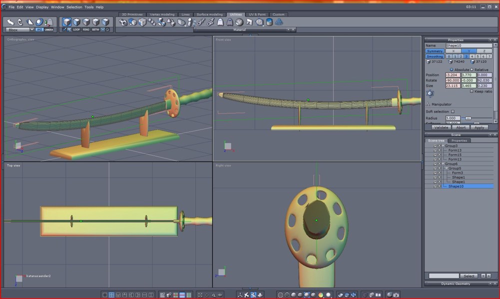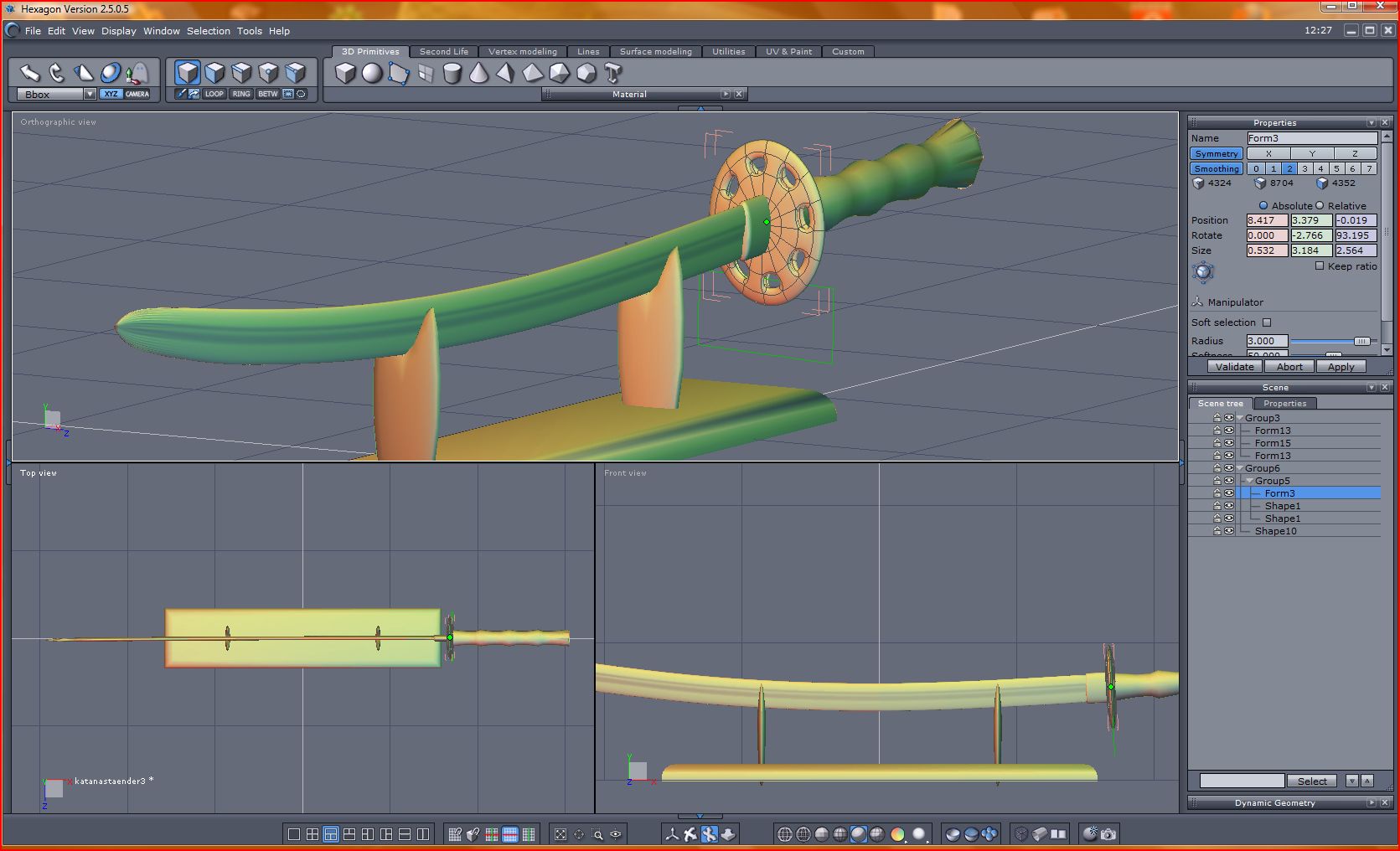 Das Katana ist jetzt fertig (abgeschl. in Hex2.5). Die Klinge hab ich noch etwas "gesmooth´ed" und den Handschutz etwas verschmälert.