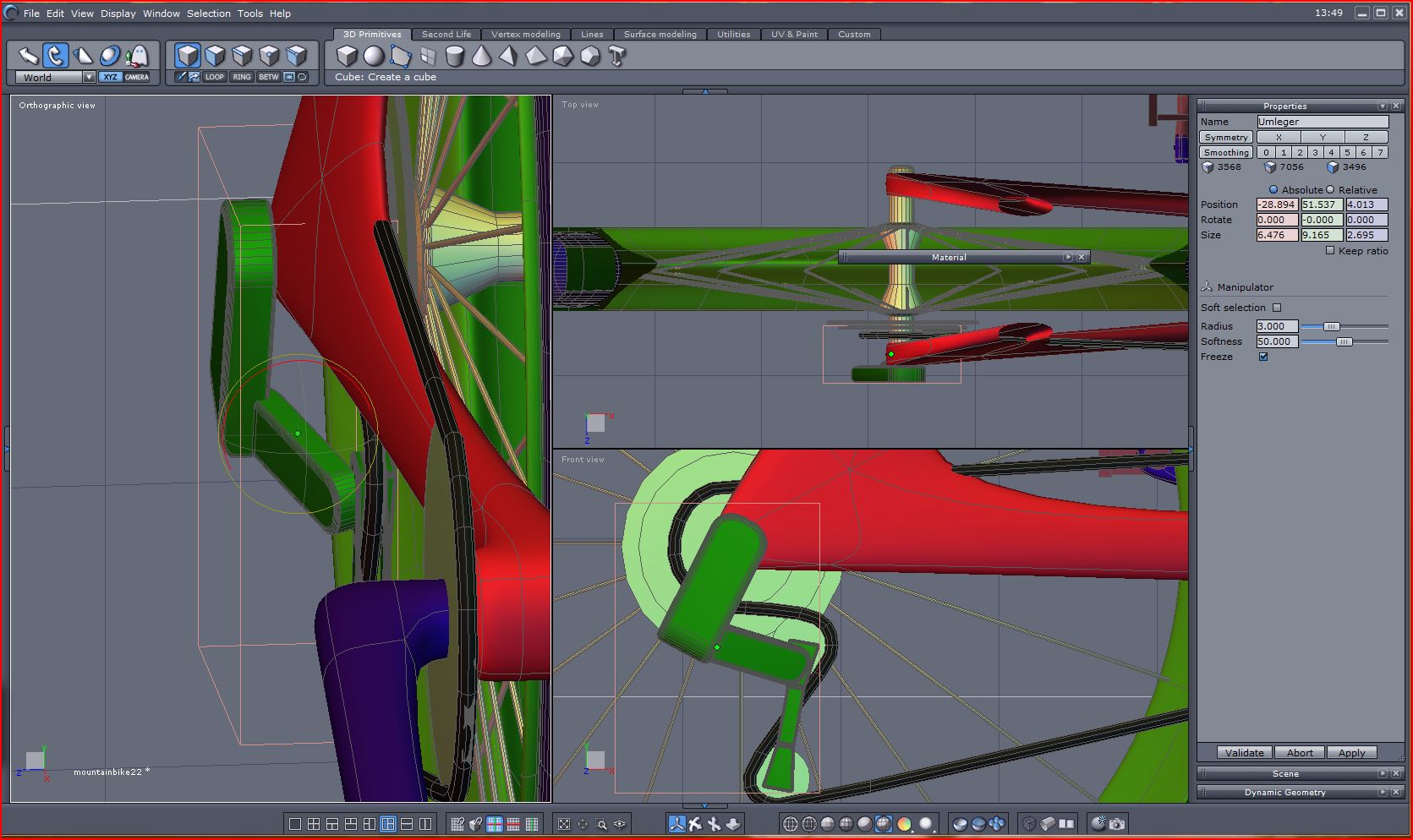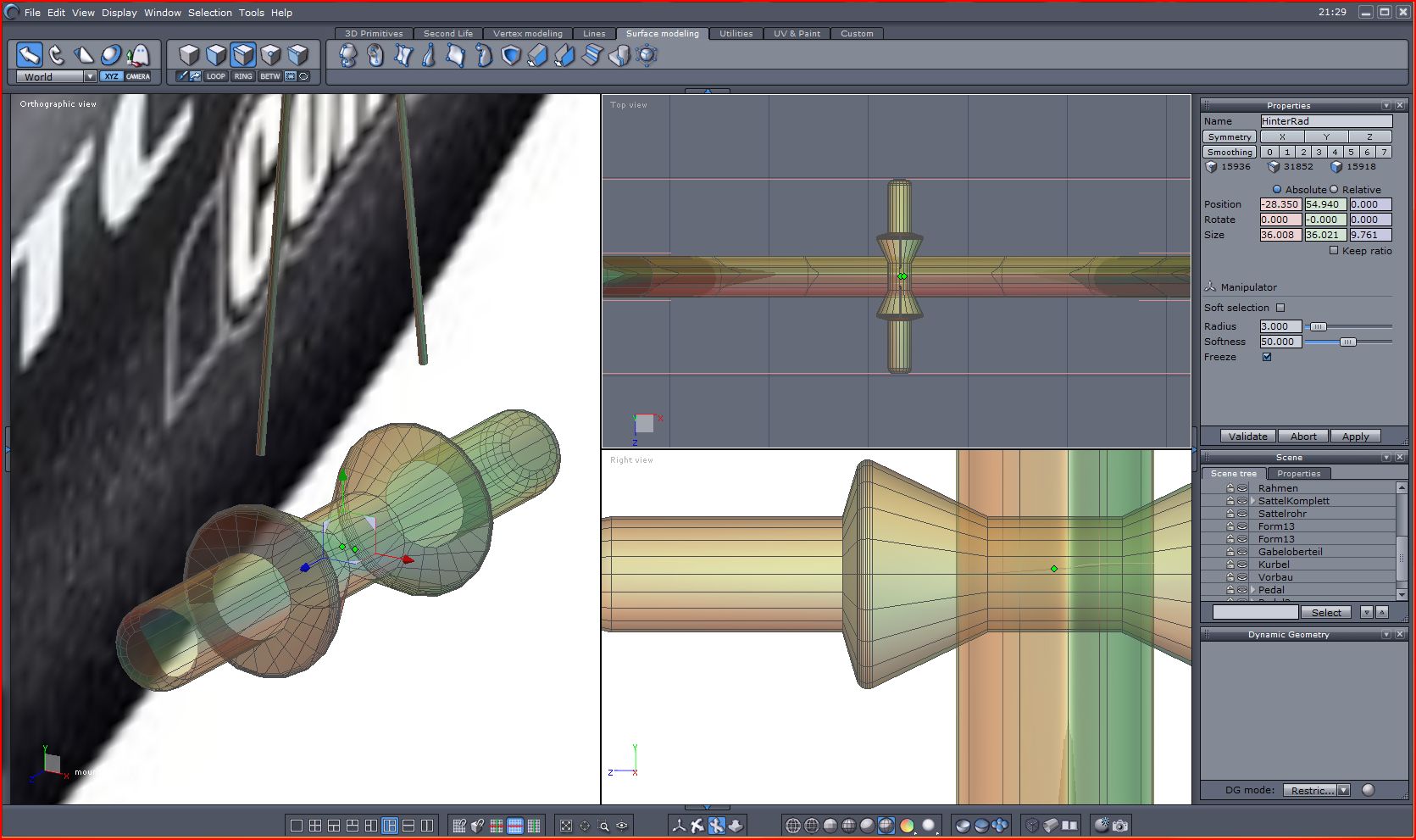 Die Nabe ist ein Zylinder, bei dem ich die Segmente etwas verschoben habe und dann mit dem "Strechtool" angepaßt habe.