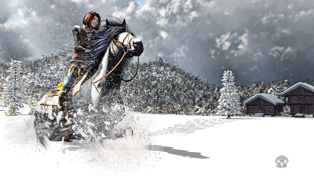 reiterin und pferd ist in poser endstanden ,landschaft in vue, schneegestöber mit ps gemacht.