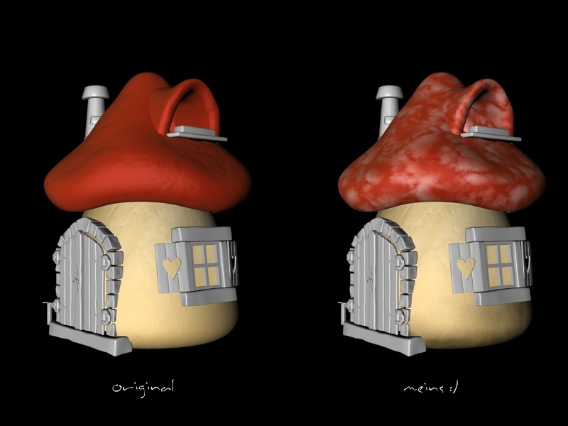 Aber was solls, dabei findet man auch tolle Sachen raus. Hier jetzt mal Texturierung von Pilztstamm und Dach.