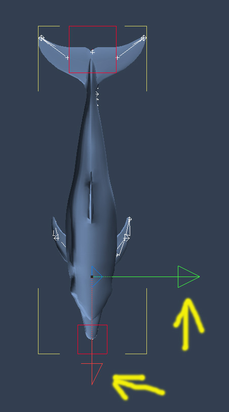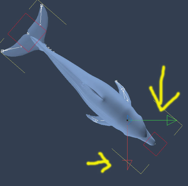 Da Du vermutlich im Model-Room den Delfin mal per Points/Faces/Edges komplett gedreht hast - müsste es so doch auch wieder zurück gehen. Also alle Points/Faces/Edges auswählen und solange drehen bis er wieder entlang der Achsen ausgerichtet ist - wie es dem Bones.System bekommt weiß ich jetzt nicht. Danach dann nur per Objekt drehen.