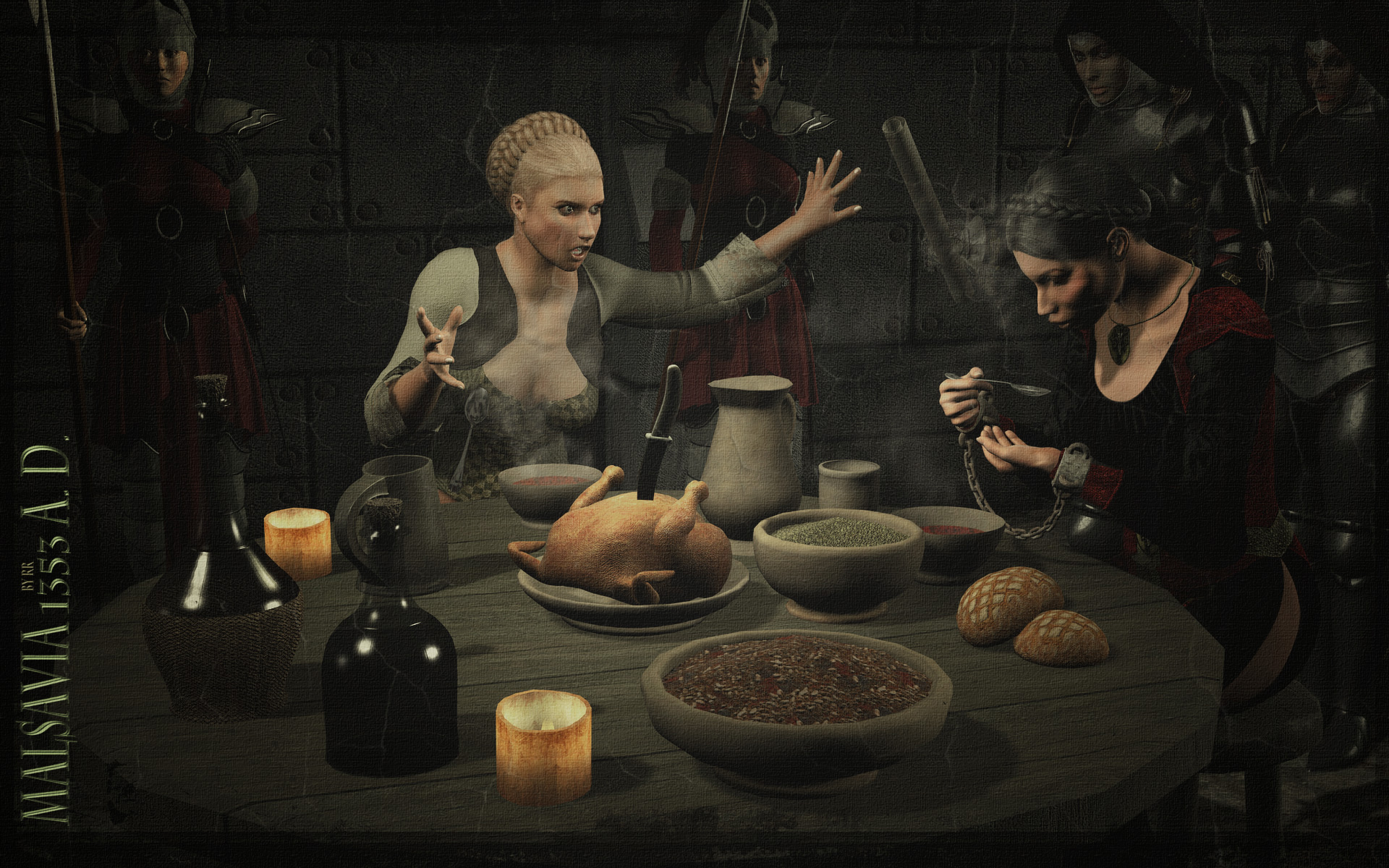 "Wache, laßt unseren Gast fertig speisen und bereitet ihr eine Kammer in den Kemenaten, laßt sie zu keiner Zeit aus den Augen..."