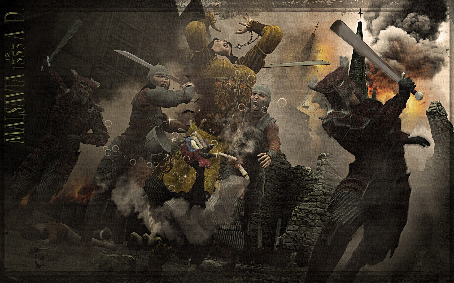 Habe die Schwerter extra "unbehandelt" gelassen (die Szene ist ohnehin in ihrer Handlung/Posen gegenüber dem Original schon stark entschärft), muß ja nicht jedesmal gleich ein Splatterbild werden...
