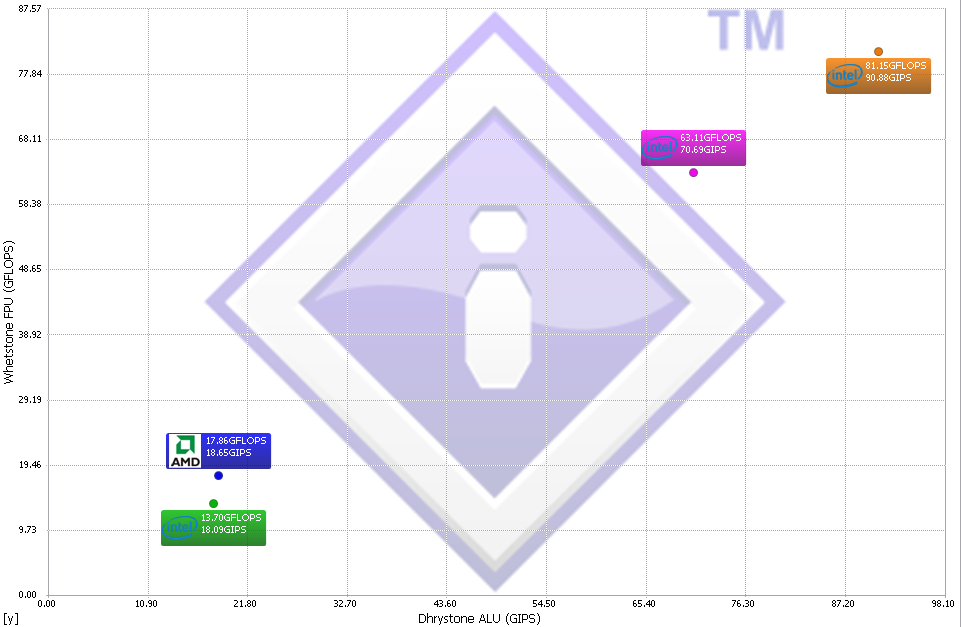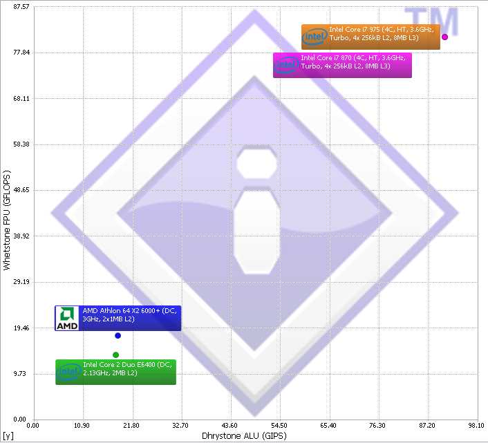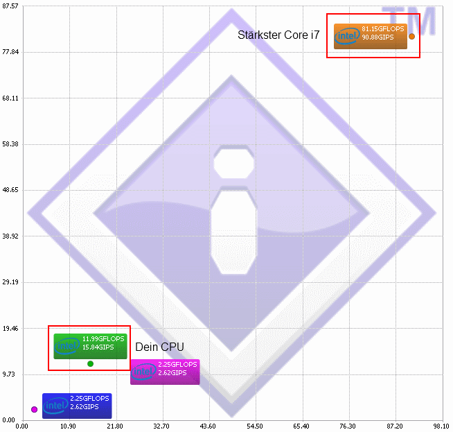 was du da gesehen hast, war ein Vergleich der Prozessorarithmetik. Auf der y-Achse sind die Gigaflops nach dem Whetstone FPU-Benchmark angegeben, auf der x-Achse der Index beim Dhrystone ALU-Benchmark. Dabei gilt bei beiden: Je höher der Wert, umso besser. Referenzsoftware war SiSandra 2010. Genau deinen Prozessor gab es nicht in der Liste, also habe ich Vergleichsweise eine Klasse darüber und darunter genommen.
