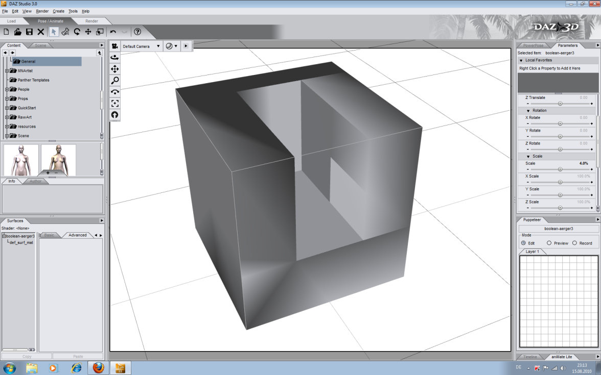 Bild ist mein Boolean-Würfel, in Hexagon erstellt, als .obj gespeichert, in Carrara 6 Pro importiert, und von da aus wieder als .obj exportiert.
