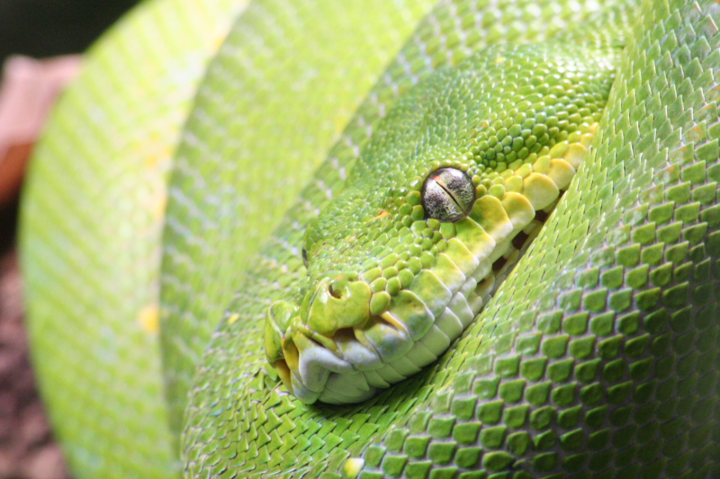 eine Fliege und ein grüner Baumpython aus dem Berliner Terrarium.