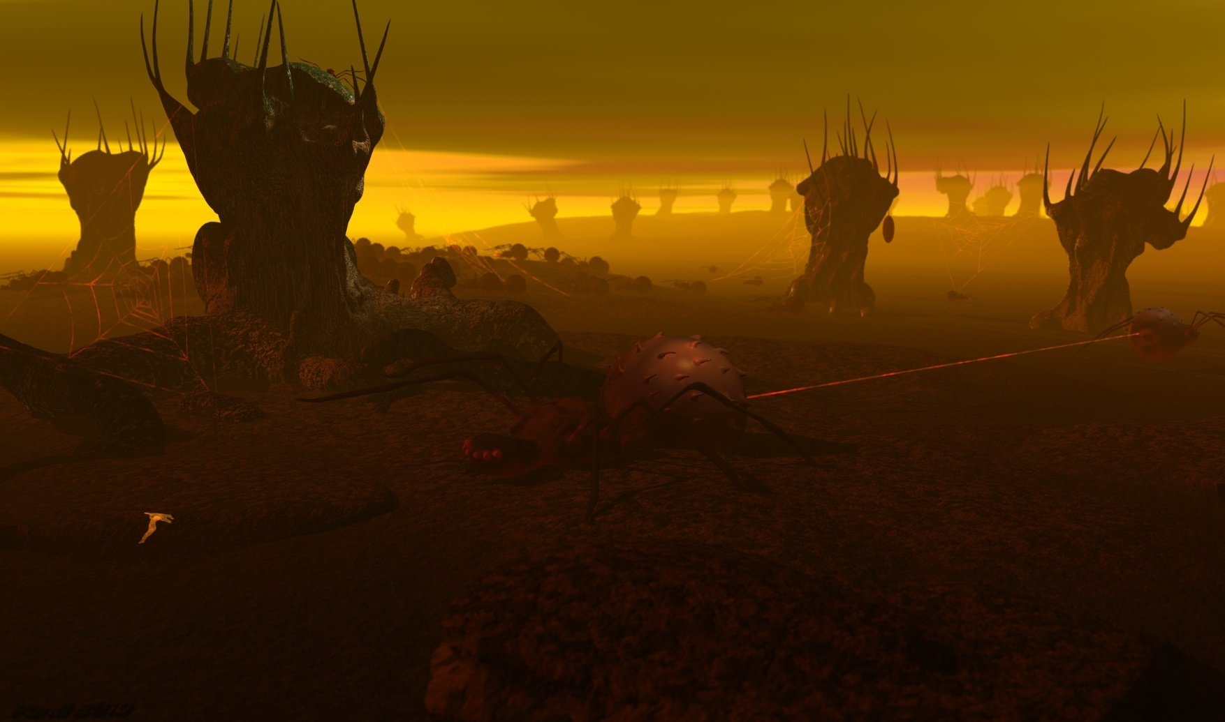Der Baum und die Spinne mit Sculptris gezupft. Das Netz mit dem Teraingenerator in Bryce gemodellt.