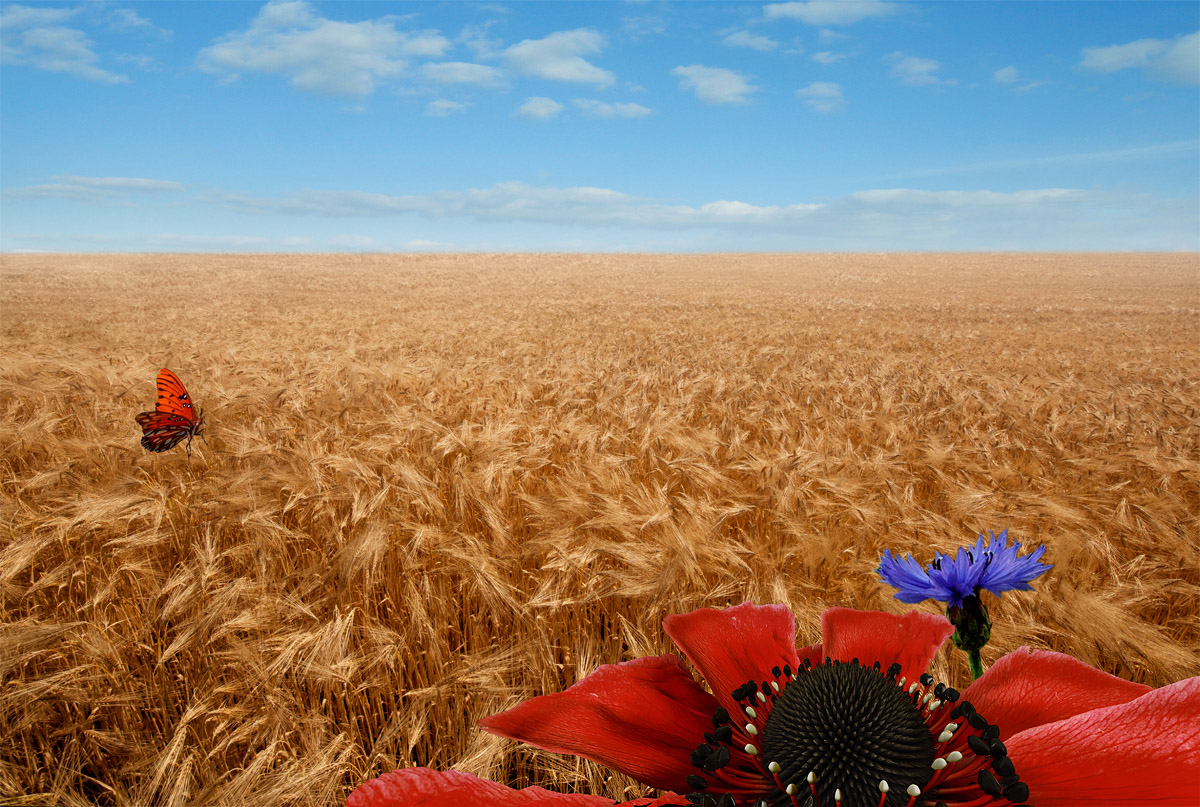 Also, das Bild ist ein Composing aus zwei realen Fotos (meine eigenen im Sommer geschossenen, nämlich das Kornfeld und der Schmetterling) und zwei Renderings, die Blumen.