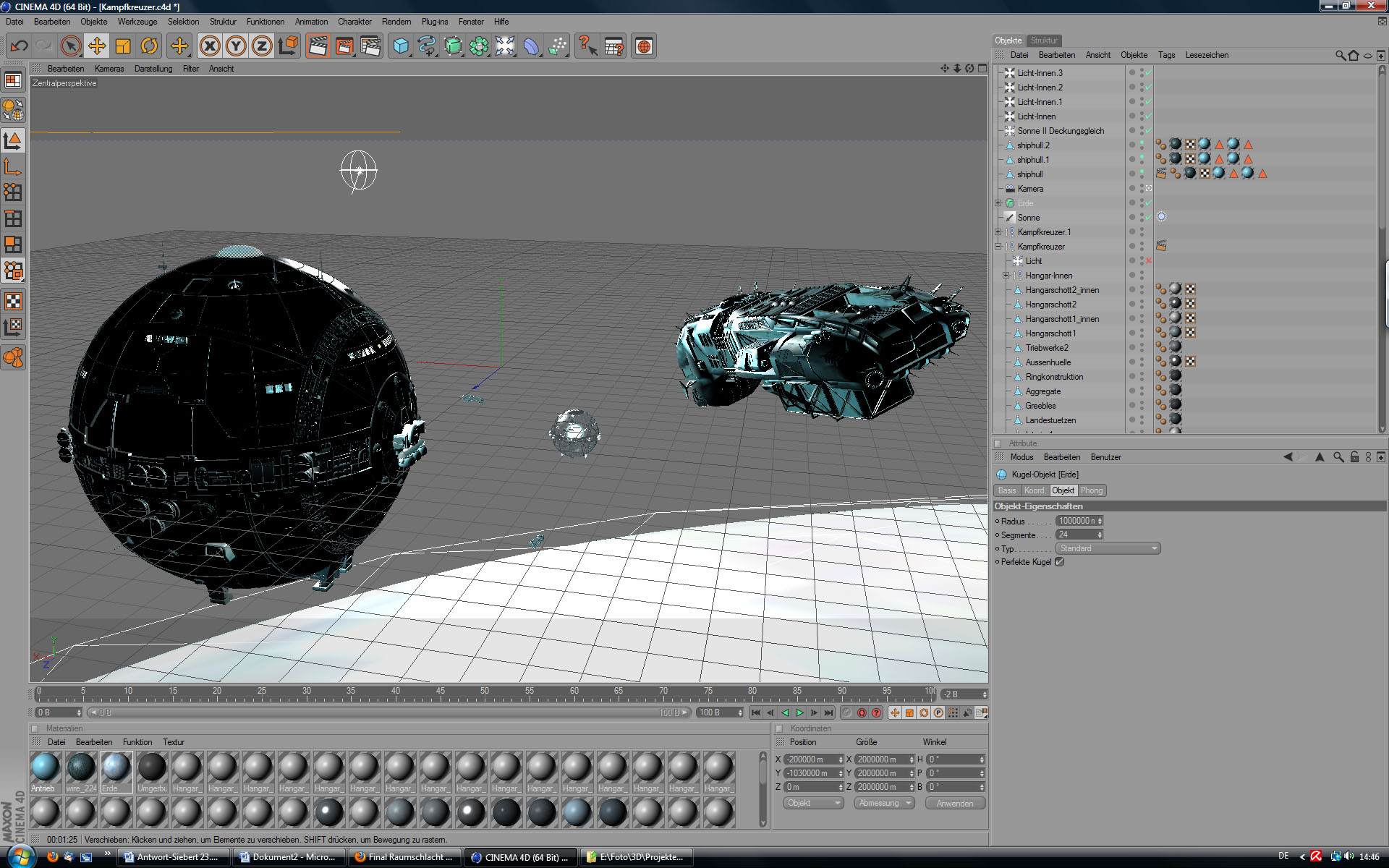 Am schwierigsten war die Lichtsituation zu simulieren - Hauptlicht Sonne und ein intensives Nebenlicht als Planetenreflexion. Letztendlich habe ich den Planeten einfach nachgebaut, eine Kugel mit 1000000m definiert und durch die Sonne anstrahlen lassen, das wirkte dann in der Tat echt und ich konnte so beliebige weitere Schiffe dazukopieren ohne die Lichter jedes Mal neu zu erstellen, sieh Bild 01.