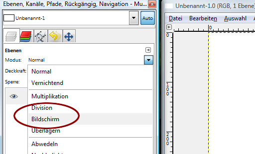 ok mal kurtz eine Zwischenfrage, hast du die Ebeneneigenschaft auf Bidschirm/Screen gesetzt? Weil wenn nicht, sieht den den Effekt nicht.